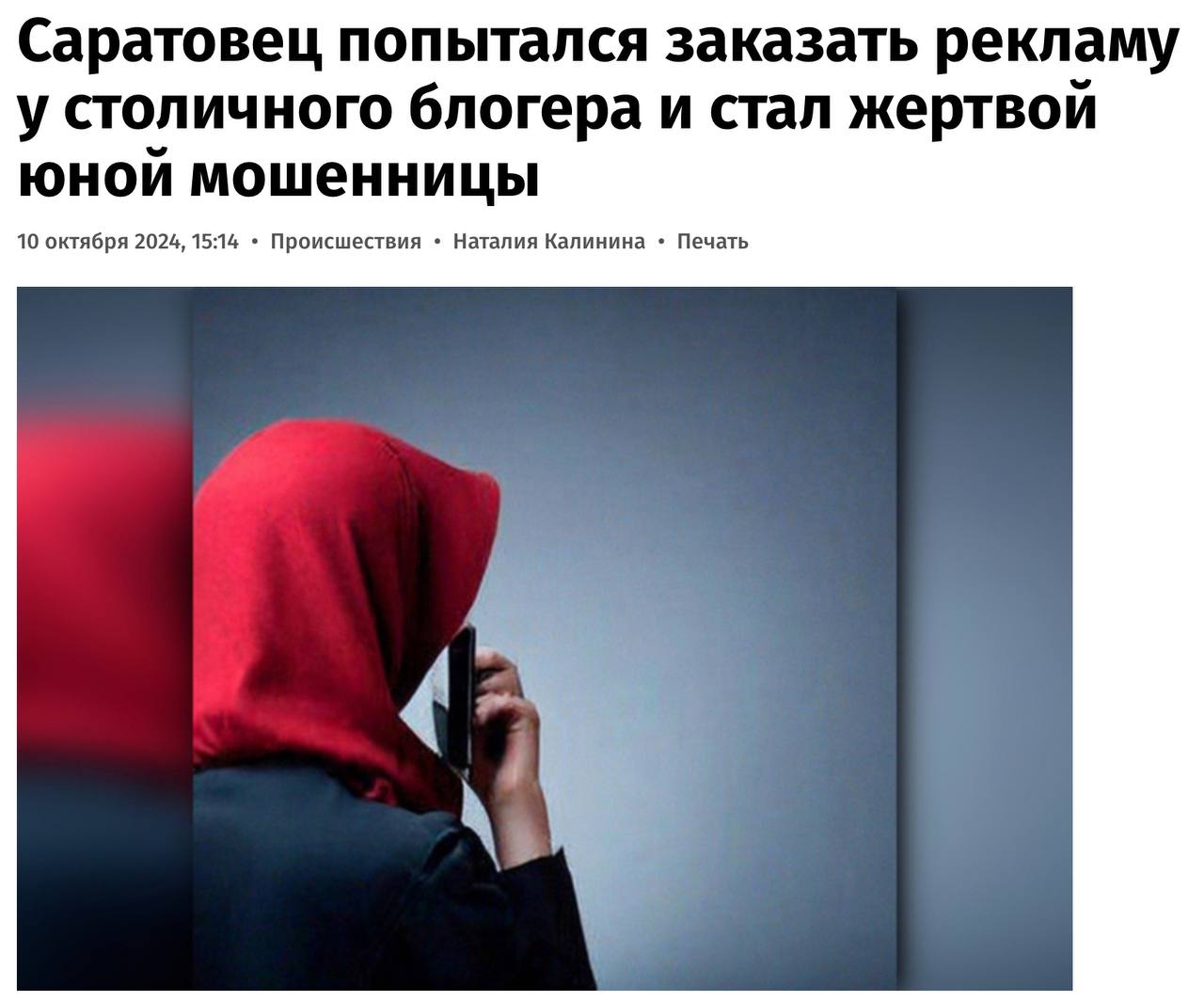 В поисках контакта пиарщика в социальной сети горожане нашли страницу женщины, которая представилась менеджером блогера. Договорившись о сделке по продвижению контента, саратовец перевел ей 530 тысяч рублей. В течение года незнакомка говорила, что работает над проектом, а потом перестала выходить на связь. Возбуждено уголовное дело по ч.3 с. 159 УК РФ (мошенничество).
