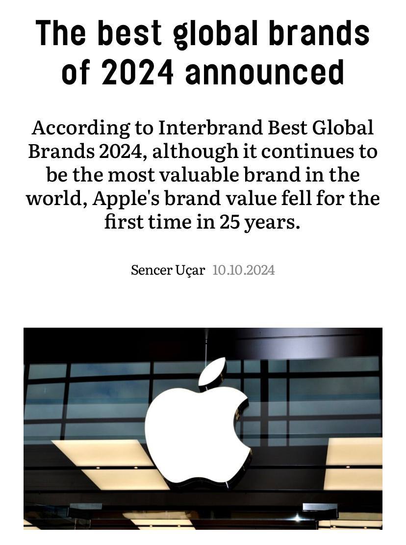 Стоимость Бренда Apple впервые за 25 лет снизилась на 3%, однако пока Apple все еще остаётся самым дорогим брендом в мире…