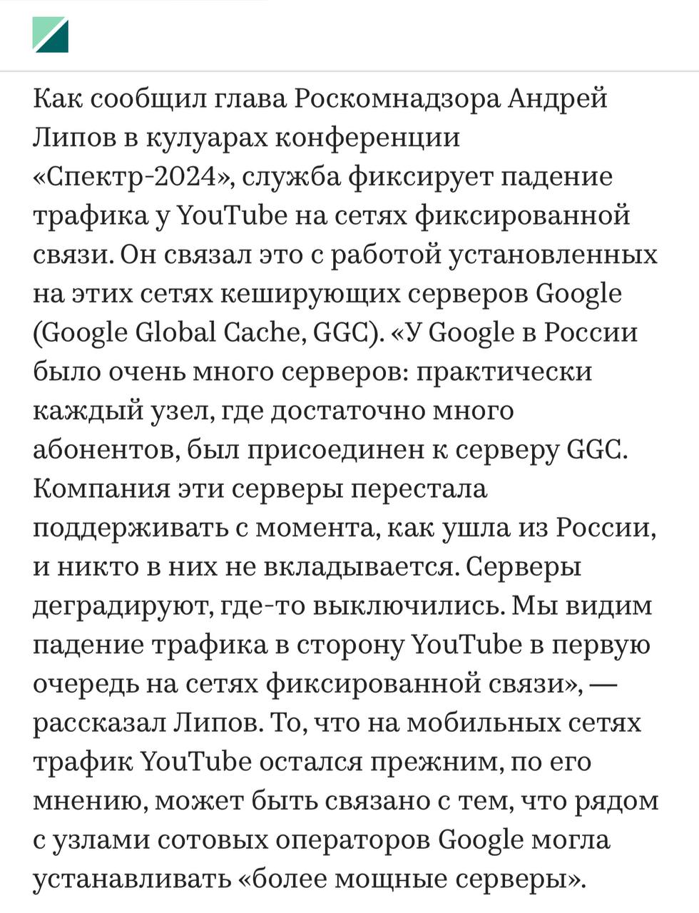 «У Google в России было очень много серверов: практически каждый узел, где достаточно много абонентов, был присоединен к серверу GGC. Компания эти серверы перестала поддерживать с момента, как ушла из России, и никто в них не вкладывается. Серверы деградируют, где-то выключились. Мы видим падение трафика в сторону YouTube в первую очередь на сетях фиксированной связи», — заявил глава Роскомнадзора Липов.