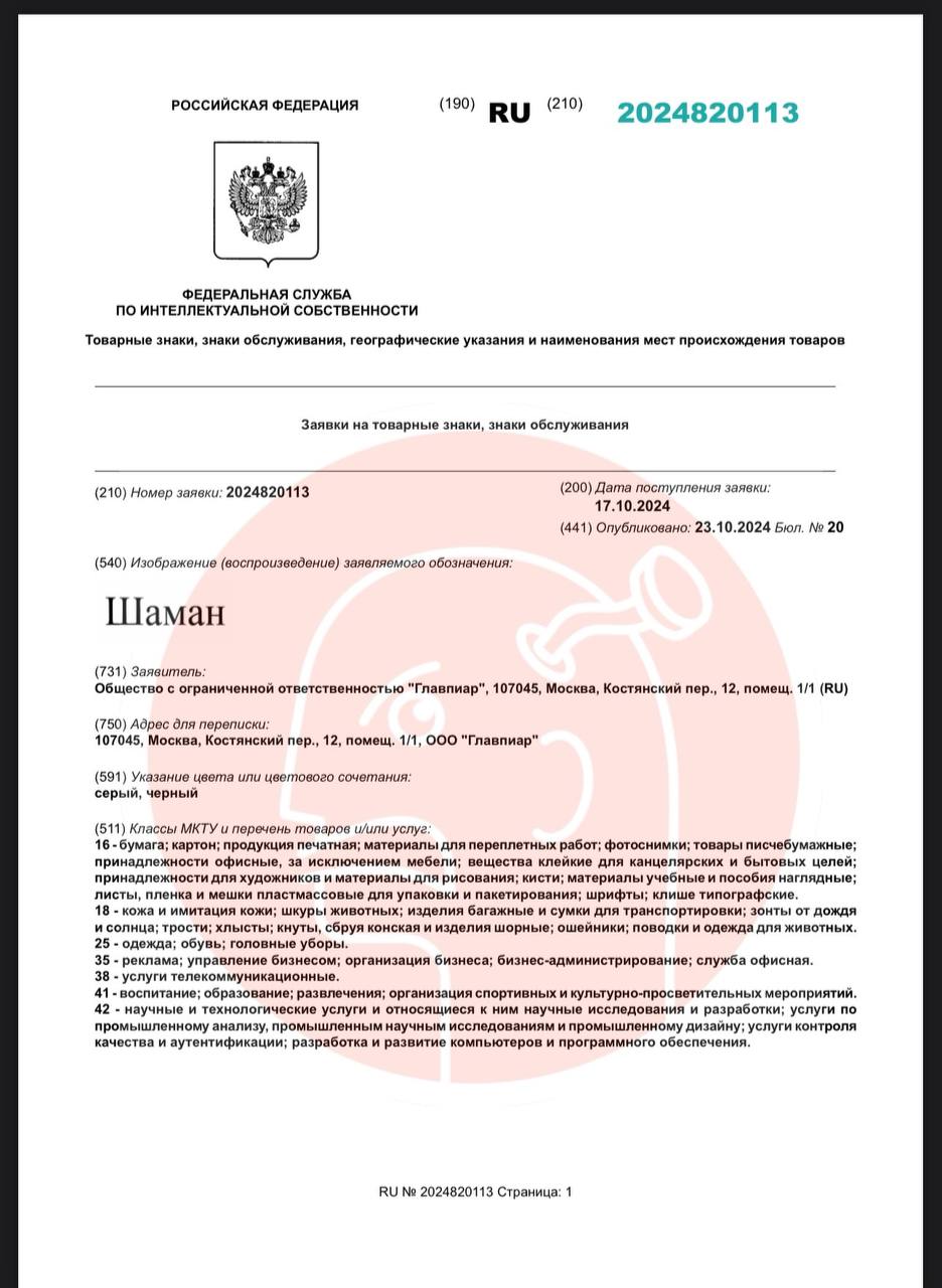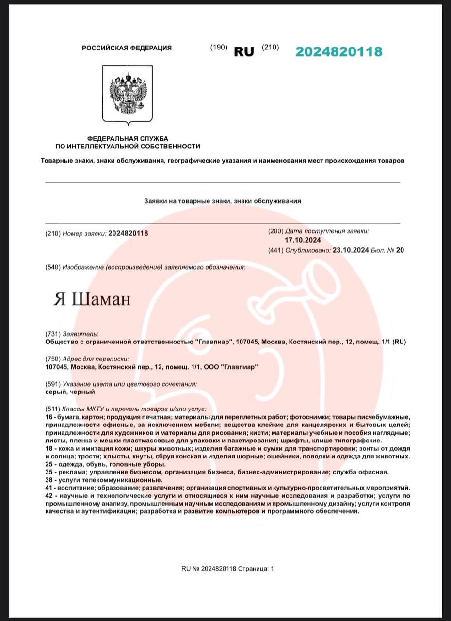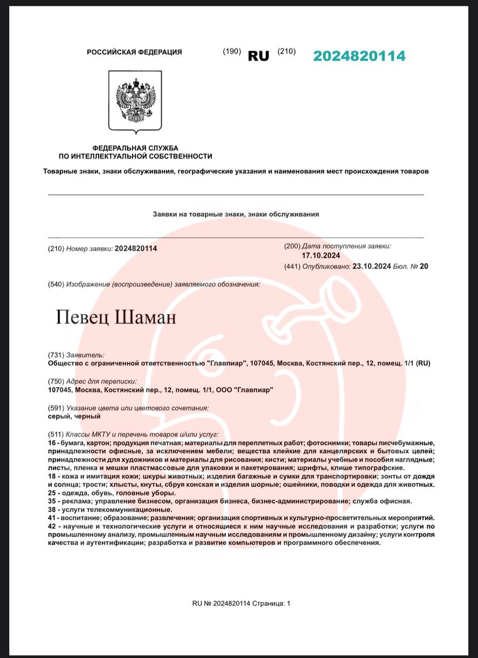 🤓 Некое агентство «Главпиар» регистрирует права на бренд «Шаман» и все с ним связанное, включая связку «Певец Шаман».