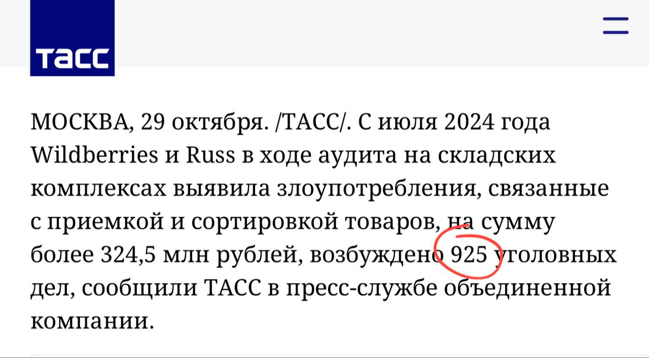 🤓 В Wildberries завели 925 уголовных дел, сообщает ТАСС. У новых хозяев — не забалуешь!