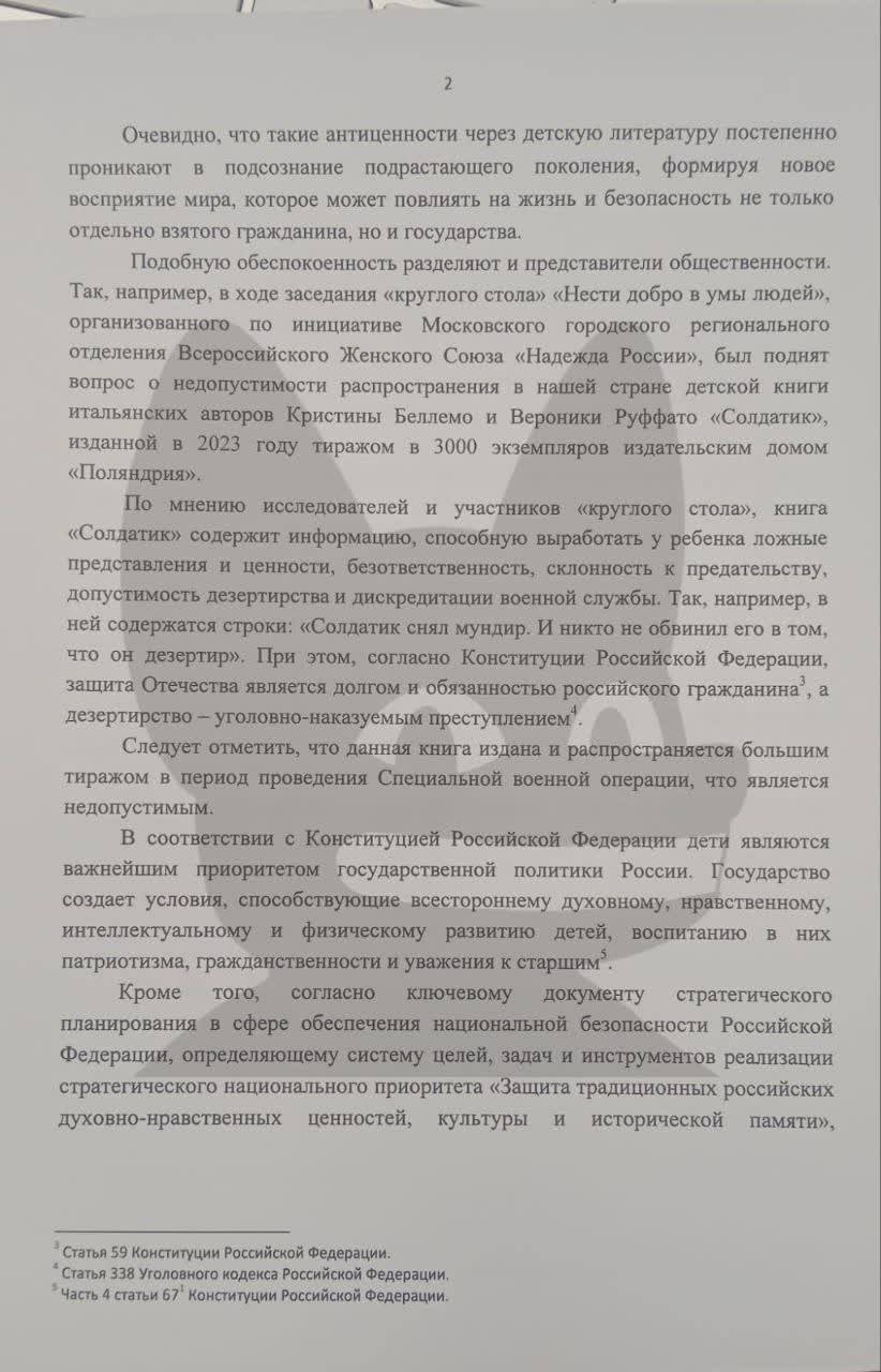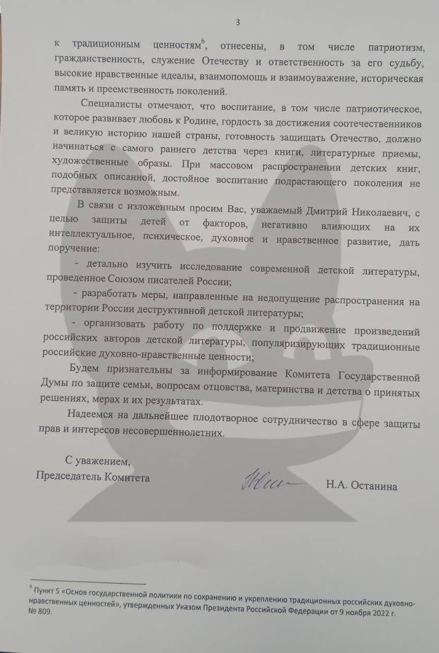 Глава комитета Нина Останина за на имя вице-премьера Дмитрий Чернышенко, в котором обращает внимание на исследование Союза писателей России.