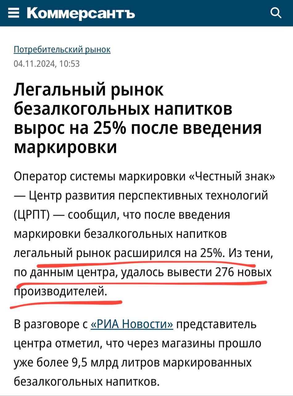 🤓Скромные результаты. За год «Честный знак» вывел из тени 25% объемов рынка безалкогольных напитков.