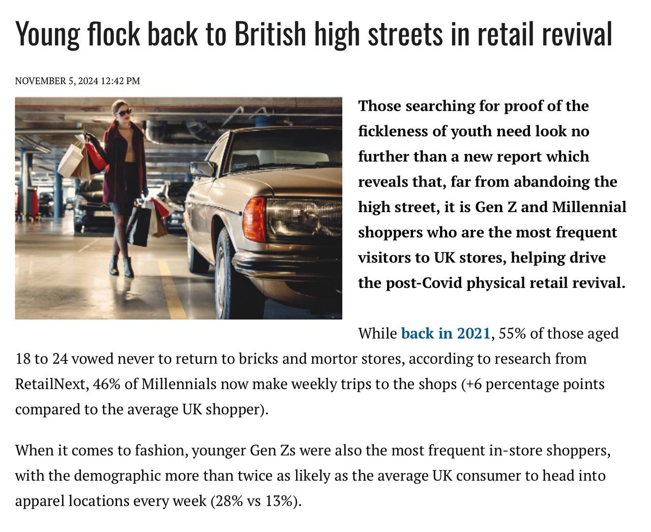 В то время как еще в 2021 году 55% лиц в возрасте от 18 до 24 лет клялись никогда не возвращаться в магазины bricks и mortor, согласно исследованию RetailNext, 46% представителей поколения миллениалов сейчас совершают еженедельные походы в магазины (+ 6 процентных пунктов по сравнению со средним покупателем в Великобритании).