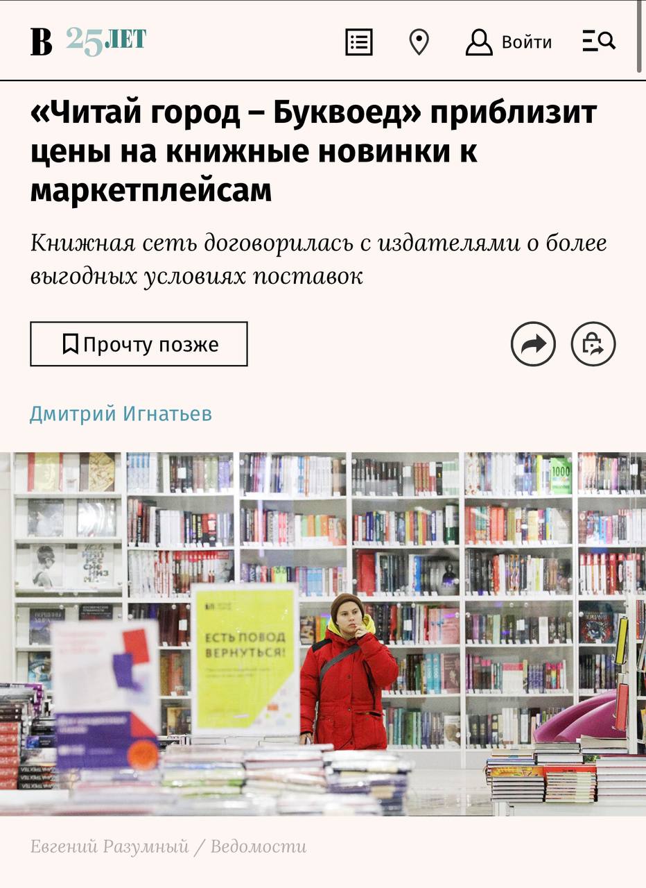ΠΡΡΠΏΠ½Π΅ΠΉΡΠ°Ρ Π² Π ΠΎΡΡΠΈΠΈ ΠΊΠ½ΠΈΠΆΠ½Π°Ρ ΡΠ΅ΡΡ «Π§ΠΈΡΠ°ΠΉ Π³ΠΎΡΠΎΠ΄ – ΠΡΠΊΠ²ΠΎΠ΅Π΄» Π·Π°ΠΊΠ»ΡΡΠΈΠ»Π° ΡΠΎΠ³Π»Π°ΡΠ΅Π½ΠΈΠ΅ Ρ ΠΈΠ·Π΄Π°ΡΠ΅Π»ΡΡΠΊΠΈΠΌ Ρ ΠΎΠ»Π΄ΠΈΠ½Π³ΠΎΠΌ «ΠΠΊΡΠΌΠΎ-ΠΠ‘Π’» ΠΈ Π³ΡΡΠΏΠΏΠΎΠΉ «ΠΠ»ΡΠΏΠΈΠ½Π°» ΠΎ ΡΠ½ΠΈΠΆΠ΅Π½ΠΈΠΈ ΡΠ΅Π½ Π½Π° ΠΊΠ½ΠΈΠΆΠ½ΡΠ΅ Π½ΠΎΠ²ΠΈΠ½ΠΊΠΈ Π² ΡΠ²ΠΎΠΈΡ ΠΎΡΠ»Π°ΠΉΠ½-ΠΌΠ°Π³Π°Π·ΠΈΠ½Π°Ρ Π½Π° 17–20% Π² ΡΡΠ°Π²Π½Π΅Π½ΠΈΠΈ Ρ 2023 Π³., ΡΠ°ΡΡΠΊΠ°Π·Π°Π» «ΠΠ΅Π΄ΠΎΠΌΠΎΡΡΡΠΌ» Π΅Π΅ Π³Π΅Π½Π΄ΠΈΡΠ΅ΠΊΡΠΎΡ ΠΠ»Π΅ΠΊΡΠ°Π½Π΄Ρ ΠΡΡΡΠΊΠΈΠ½. ΠΡΠ° ΠΌΠ΅ΡΠ° Π½Π΅ΠΎΠ±Ρ ΠΎΠ΄ΠΈΠΌΠ°, ΡΡΠΎΠ±Ρ ΠΏΡΠΈΠ±Π»ΠΈΠ·ΠΈΡΡ «Π±ΠΎΠ»Π΅Π΅ Π²ΡΡΠΎΠΊΠΈΠ΅» ΡΠ΅Π½Ρ Π² ΡΠΎΠ·Π½ΠΈΡΠ΅ «ΠΊ ΡΡΠΎΠ²Π½Ρ ΠΌΠ°ΡΠΊΠ΅ΡΠΏΠ»Π΅ΠΉΡΠΎΠ²», ΠΏΠΎΡΡΠ½ΠΈΠ» ΠΎΠ½.