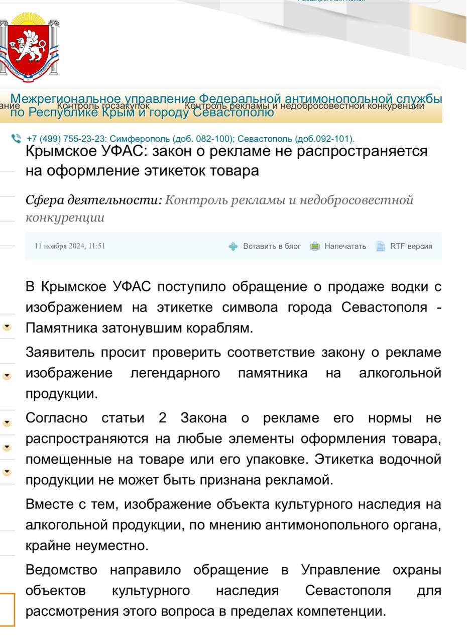 🤓Интересное решение УФАС Крыма. Изображение на этикетке — не является рекламой, поэтому не регулируется Законом о рекламе. Однако, изображение памятника, как объекта культурного наследия, на этикетке водки — недопустимо.