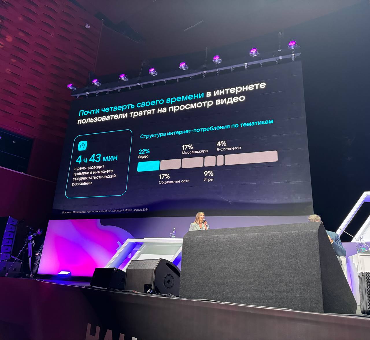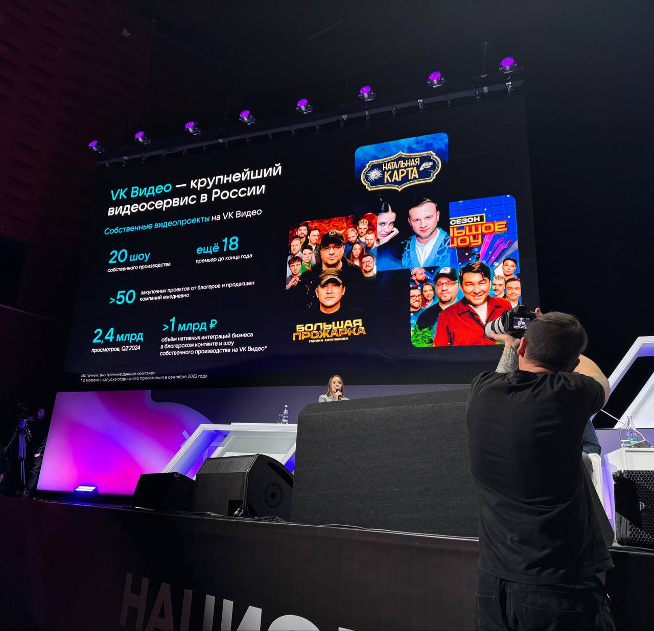 🤓 ВК начал доклад с видео. Рассказывает о своем видеосервисе и собственном контенте. Далее — про торговлю через видеоконтент. Смешно, что они хотят построить коммерцию, не сформировав потоки аудитории.