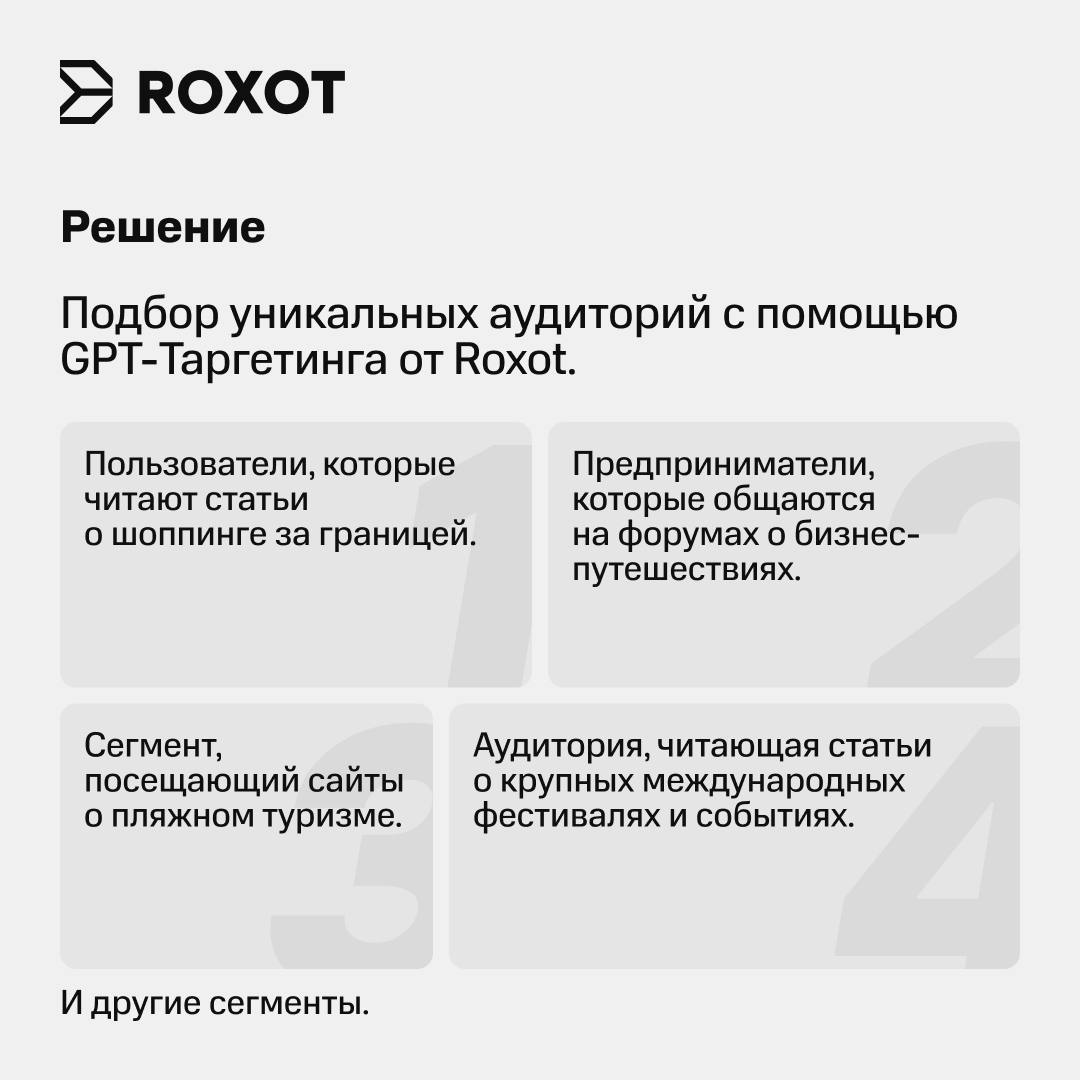 GPT-Таргетинг от Roxot подобрал новые аудитории, недоступные в других DSP: от пользователей, читающих обзоры аутлетов за границей, до людей, изучающих статьи о международных фестивалях.