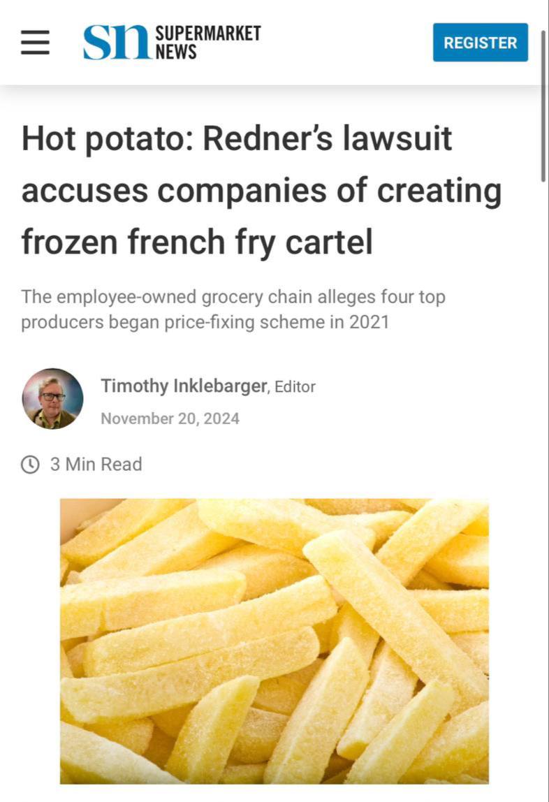 В США частная региональная продуктовая сеть Redner's Markets подала в суд на крупнейшие аграрные компании страны, утверждая, что четыре доминирующих производителя замороженных картофельных продуктов вступили в сговор с целью повышения цен и обмана потребителей.