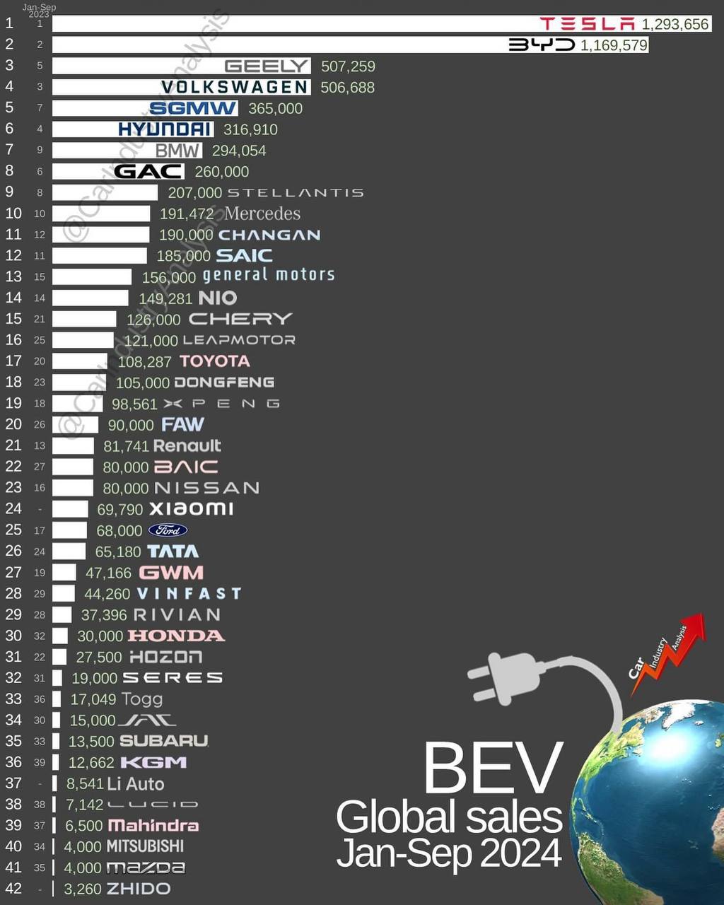 BYD ΠΏΠΎΠ΄ΠΆΠΈΠΌΠ°Π΅Ρ Π’Π΅ΡΠ»Ρ, ΠΈΠ· ΡΡΠ°ΡΠΈΡΠΊΠΎΠ² Π² Π΄Π΅ΡΡΡΠΊΠ΅ — VW Π½Π° 4 ΠΈ BMW Π½Π° 7.