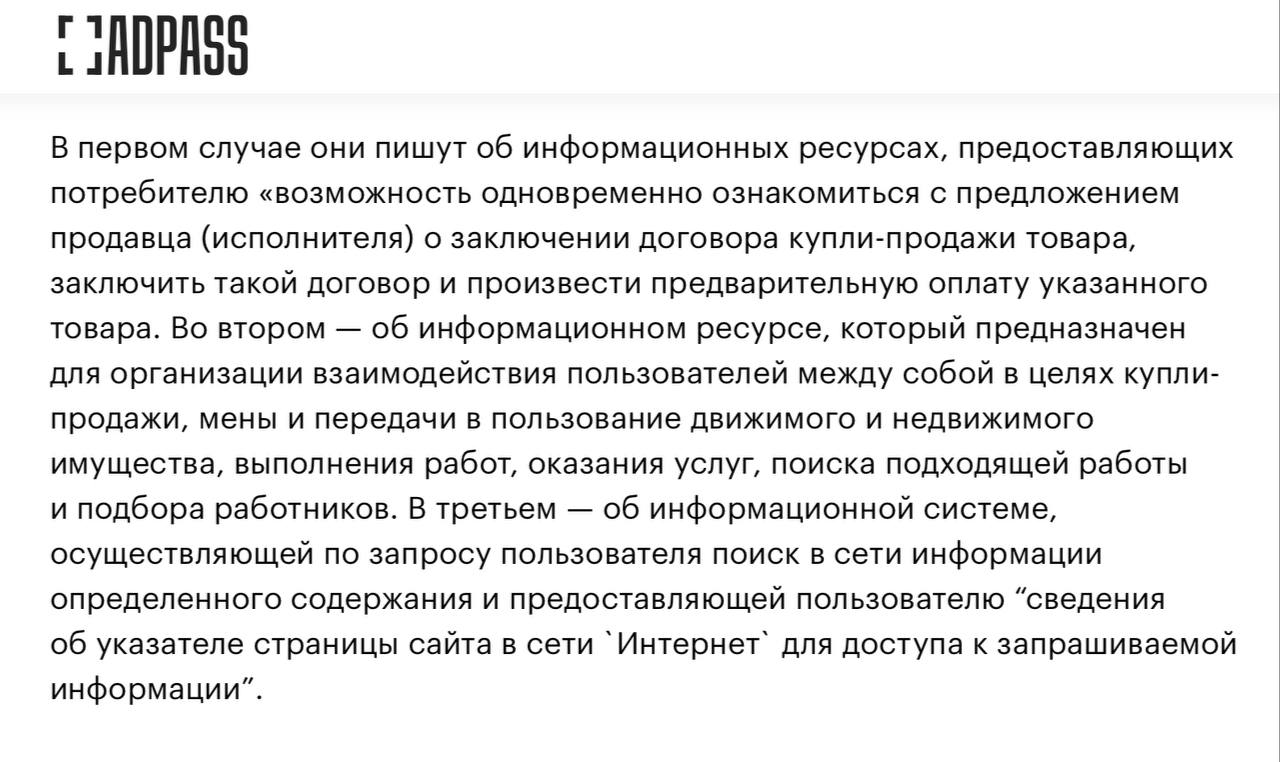Любопытный нюанс. Закон касается трех типов интернет-площадок: маркетплейсы, электронные доски объявлений (классифайды), а также поисковики. При этом, в тексте авторы документа не используют общепринятые названия этих сайтов, а придумывают им новые названия☝🏻. Кажется, это говорит о том, что экспертов законотворцы позвать забыли и пишут текст по собственному наитию.