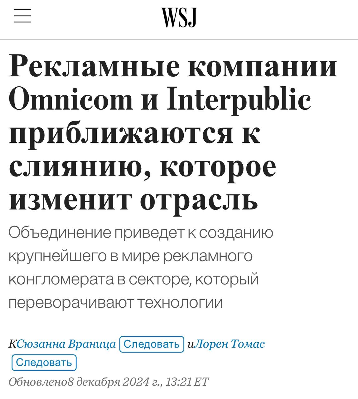 π€ ΠΠ»ΡΠ΄ΠΈΡΠ΅ ΡΡΠΎ Π² ΠΌΠΈΡΠ΅ ΡΠ²ΠΎΡΠΈΡΡΡ! Π Π΅ΠΊΠ»Π°ΠΌΠ½ΡΠΉ ΠΈ ΠΌΠ°ΡΠΊΠ΅ΡΠΈΠ½Π³ΠΎΠ²ΡΠΉ ΠΊΠΎΠ½Π³Π»ΠΎΠΌΠ΅ΡΠ°Ρ Omnicom Group Π²Π΅Π΄Π΅Ρ ΠΏΠ΅ΡΠ΅Π³ΠΎΠ²ΠΎΡΡ Π½Π° ΡΠΈΠ½Π°Π»ΡΠ½ΠΎΠΉ ΡΡΠ°Π΄ΠΈΠΈ ΠΎ ΠΏΡΠΈΠΎΠ±ΡΠ΅ΡΠ΅Π½ΠΈΠΈ Interpublic Group.