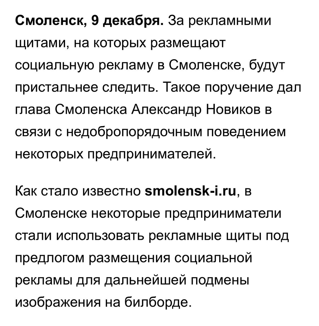 «Π Π΅ΠΊΠ»Π°ΠΌΠ½ΡΠ΅ ΠΊΠΎΠ½ΡΡΡΡΠΊΡΠΈΠΈ ΡΡΡΠ°Π½Π°Π²Π»ΠΈΠ²Π°ΡΡΡΡ ΡΠΊΠΎΠ±Ρ ΠΏΠΎΠ΄ ΡΠΎΡΠΈΠ°Π»ΡΠ½ΡΡ ΡΠ΅ΠΊΠ»Π°ΠΌΡ (Π½Π°ΠΏΡΠΈΠΌΠ΅Ρ, Π‘ΠΠ), ΠΏΡΠΈ ΡΡΠΎΠΌ ΡΠΎΡΡΠ΅ΠΊΠ»Π°ΠΌΠ° Π²ΠΈΡΠΈΡ Π΄Π΅Π½Ρ-Π΄Π²Π°, Π° Π·Π°ΡΠ΅ΠΌ Π½Π° Π΅Π΅ ΠΌΠ΅ΡΡΠ΅ ΠΏΠΎΡΠ²Π»ΡΠ΅ΡΡΡ ΠΊΠΎΠΌΠΌΠ΅ΡΡΠ΅ΡΠΊΠ°Ρ ΡΠ΅ΠΊΠ»Π°ΠΌΠ°. ΠΡΠΎΡΡΠ±Π° Π²ΡΡΠ²Π»ΡΡΡ ΡΠ°ΠΊΠΈΠ΅ ΡΠΈΡΡΠ°ΡΠΈΠΈ ΠΈ ΠΏΡΠΈΠ½ΠΈΠΌΠ°ΡΡ ΠΌΠ΅ΡΡ ΠΏΠΎ Π΄Π΅ΠΌΠΎΠ½ΡΠ°ΠΆΡ», — ΠΏΠΎΡΡΡΠΈΠ» Π³Π»Π°Π²Π° Π‘ΠΌΠΎΠ»Π΅Π½ΡΠΊΠ°.