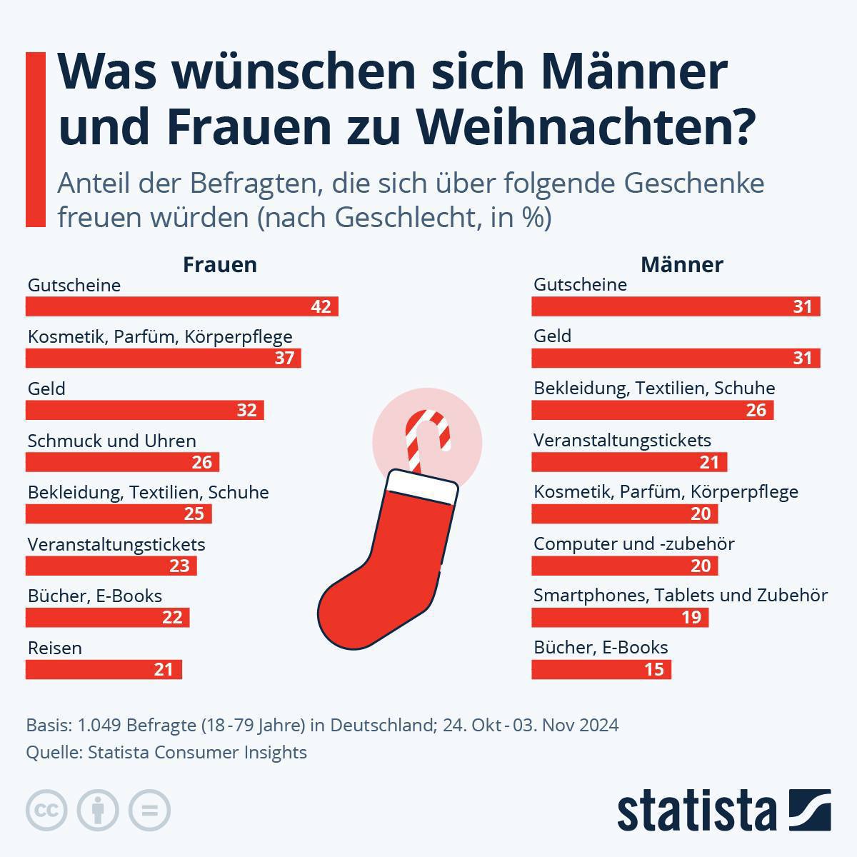 Поэтому около трети немцев — сугубо за подарочные сертификаты. 42% женщин и 31% мужчин в Германии хотели бы получить купоны или ваучеры в качестве подарка на Рождество.