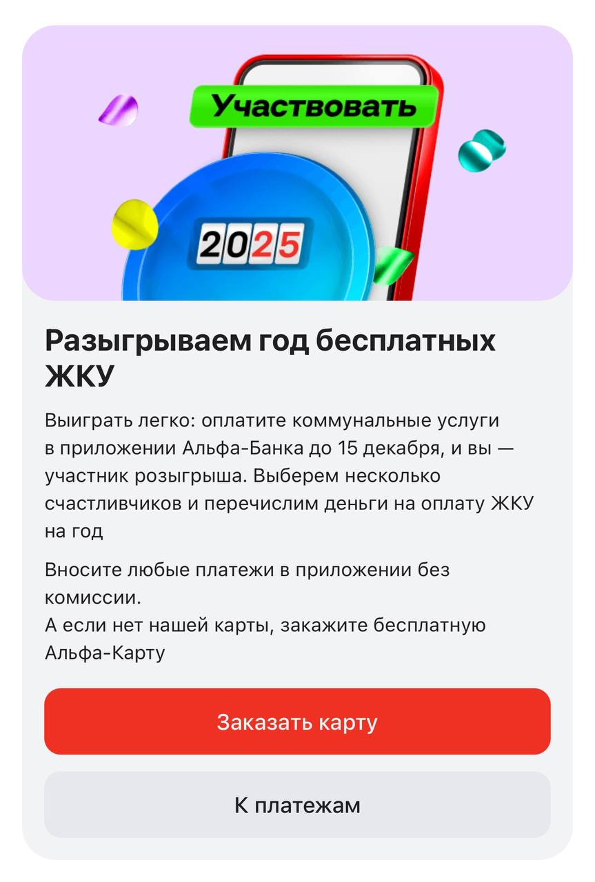 🤔 Какой странный мотивирующий приз от Альфа-банка. Год оплаты ЖКХ. Что дальше? Питание на квартал? Теплые валенки на 10 лет? Проездной на метро до следующей осени?