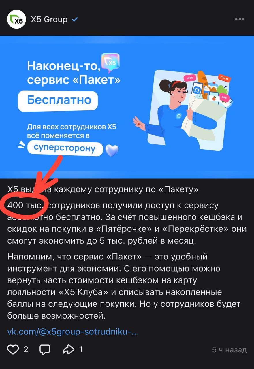🤓 X5 сообщает что у них трудится 400 тысяч человек. Согласно статистике Росстата, это сопоставимо с числом населения: Курска, Иваново, Магнитогорска, Чебоксар или Твери.