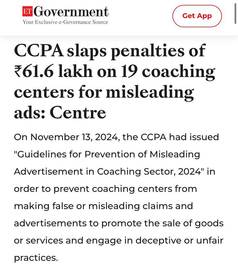 Центральное управление по защите прав потребителей (CCPA) наложило штрафы в размере 61,60 лакха (820 000 $) на 19 институтов коучинга из-за обманчивых заявлений в рекламе коучинга, особенно в отношении показателей успешности и качества курсов.