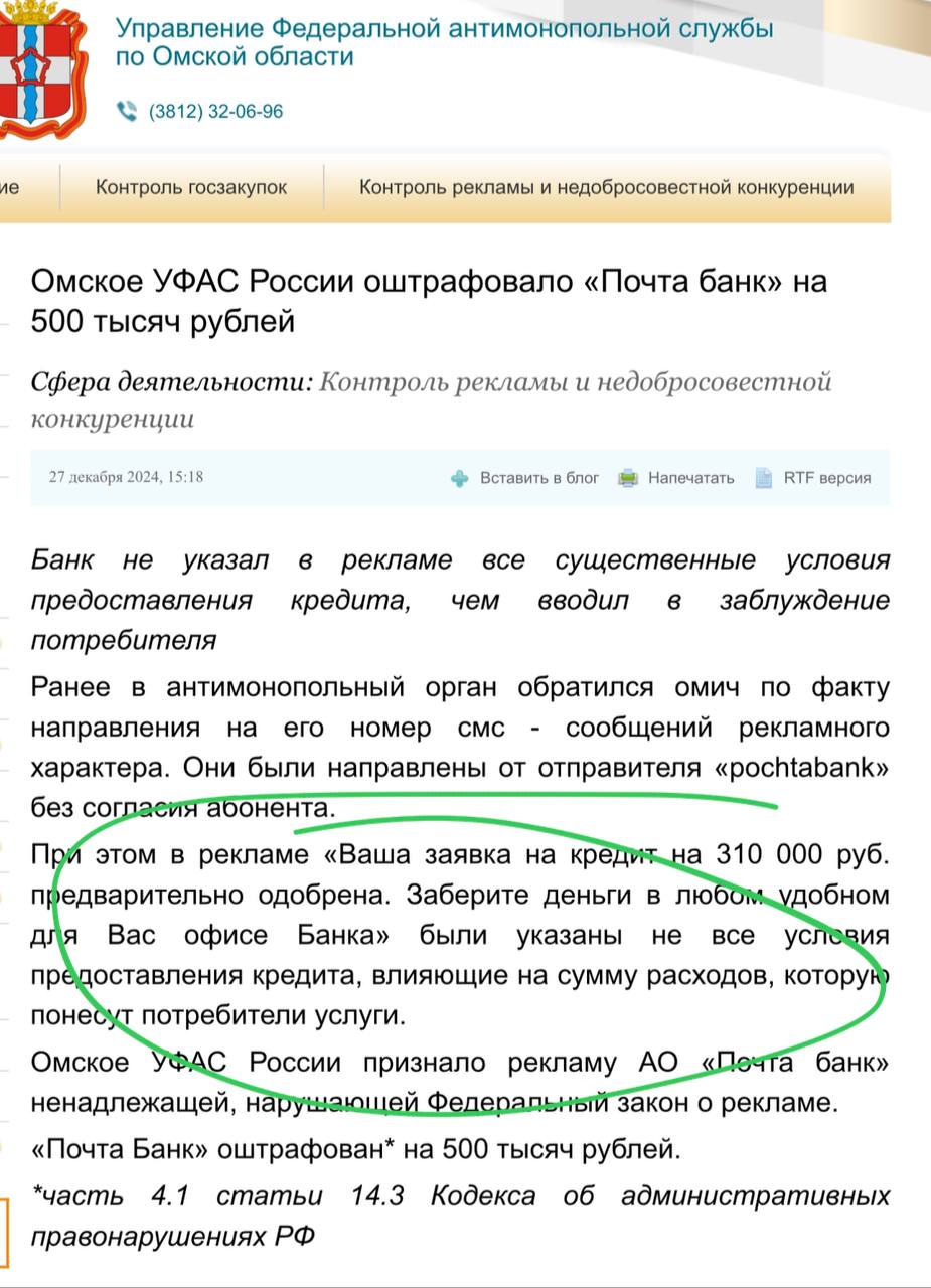 🤔 По мнению Омского УФАС даже в рекламной смске должны быть раскрыты все условия предоставления кредита.