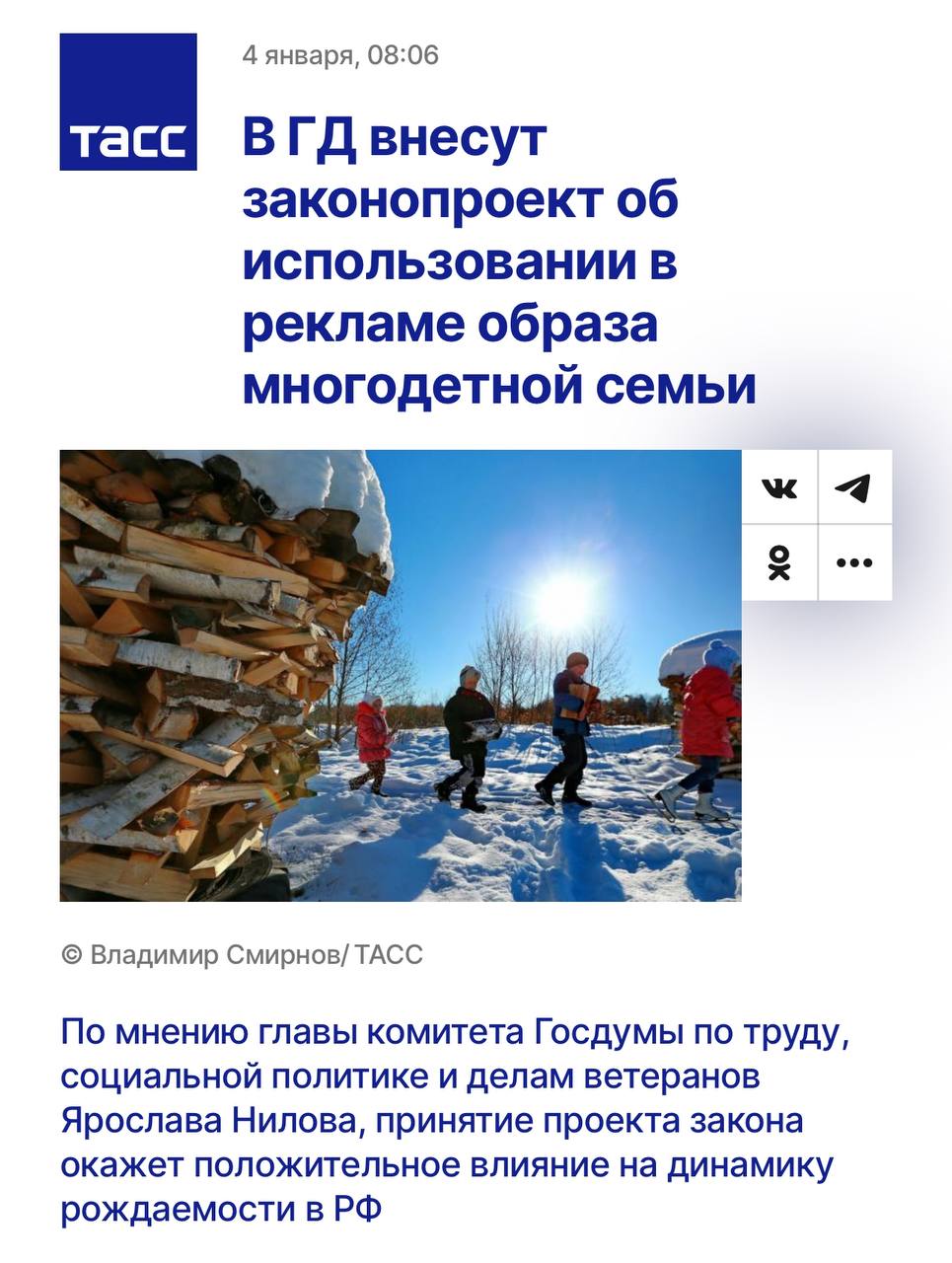 "В случае размещения на телеканале (в телепрограммах, телепередачах) рекламы, направленной на формирование позитивного образа многодетной семьи, рекламодатели, рекламораспространители и их представители и посредники обязаны использовать образы семей с тремя и более детьми", - говорится в проекте закона.