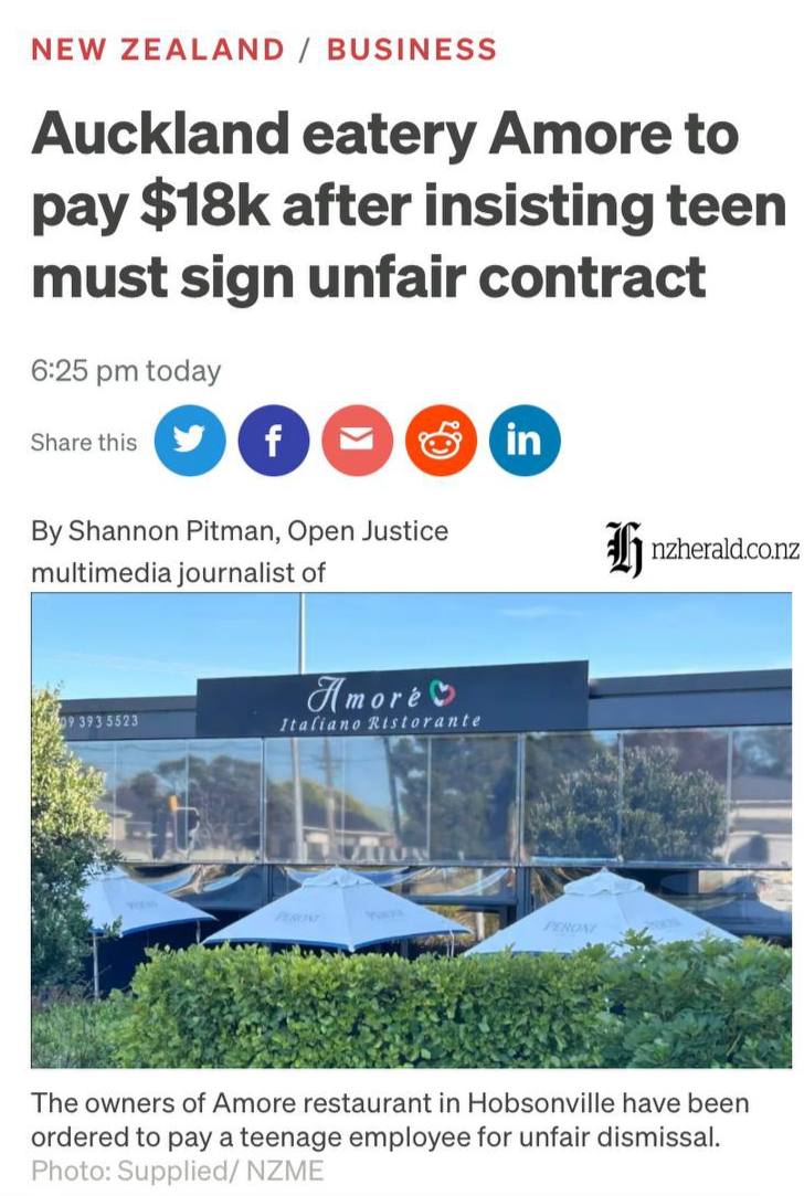 Жертва произвола работодателя не сдалась, а пошла в суд. Теперь закусочная Amore в Окленде выплатит ей 18 тысяч $ компенсаций.