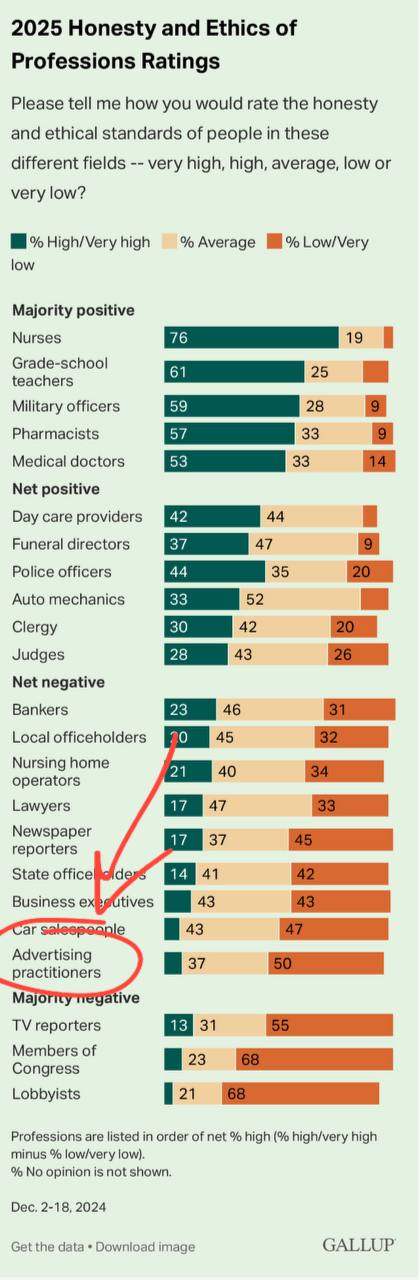 Зачем дополнительно исследовать эти факты нам совершенно неясно, тем не менее, институт Gallup в очередной раз сообщает очевидное: представители рекламного рынка — наименее надежные люди в глазах американцев.