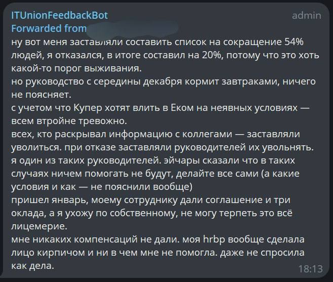 Π «ΠΡΠΏΠ΅ΡΠ΅», «ΠΠ΅Π³Π°ΠΠ°ΡΠΊΠ΅ΡΠ΅», «Π‘Π±Π΅ΡΠΠΎΠ³ΠΈΡΡΠΈΠΊΠ΅» ΠΈ «Π‘Π°ΠΌΠΎΠΊΠ°ΡΠ΅» Π½Π°ΡΠΈΠ½Π°Π΅ΡΡΡ Π²ΠΎΠ»Π½Π° ΡΠ²ΠΎΠ»ΡΠ½Π΅Π½ΠΈΠΉ. Π ΡΡΠΌ Π½Π°ΠΌ Π² ΠΎΠ±ΡΠ°ΡΠ½ΠΎΠΉ ΡΠ²ΡΠ·ΠΈ ΡΠΎΠΎΠ±ΡΠΈΠ»ΠΈ ΡΠΎΡΡΡΠ΄Π½ΠΈΠΊΠΈ ΡΡΠΈΡ ΠΎΡΠ³Π°Π½ΠΈΠ·Π°ΡΠΈΠΉ. ΠΡΠ΅ ΡΠ΅ΡΡΡΠ΅ ΠΊΠΎΠΌΠΏΠ°Π½ΠΈΠΈ Π²Ρ ΠΎΠ΄ΡΡ Π² Ecom tech. Π£Π²ΠΎΠ»ΡΠ½ΡΡΡ Π±ΡΠ΄ΡΡ ΠΎΡ 30% Π΄ΠΎ 50% ΡΠΎΡΡΡΠ΄Π½ΠΈΠΊΠΎΠ² Π² Π·Π°Π²ΠΈΡΠΈΠΌΠΎΡΡΠΈ ΠΎΡ ΠΊΠΎΠΌΠΏΠ°Π½ΠΈΠΈ. ΠΡΠΎ Π·Π°ΡΡΠΎΠ½Π΅Ρ ΠΈ Π°ΠΉΡΠΈΡΠ½ΠΈΠΊΠΎΠ². ΠΡΠΈΡΠΈΠ°Π»ΡΠ½ΠΎΠ³ΠΎ Π·Π°ΡΠ²Π»Π΅Π½ΠΈΡ ΠΏΠΎΠΊΠ° Π½Π΅ Π±ΡΠ»ΠΎ, Π½ΠΎ ΡΠ»ΡΡ ΠΈ Π½Π°ΡΠΈΠ½Π°ΡΡ Π΄ΠΎΡ ΠΎΠ΄ΠΈΡΡ Π΄ΠΎ ΡΠΎΡΡΡΠ΄Π½ΠΈΠΊΠΎΠ² ΠΎ ΡΡΠΌ ΡΠ²ΠΈΠ΄Π΅ΡΠ΅Π»ΡΡΡΠ²ΡΠ΅Ρ ΡΠΎΡΡ ΠΊΠΎΠ»ΠΈΡΠ΅ΡΡΠ²Π° ΠΎΡΠΊΡΡΡΡΡ ΡΠ΅Π·ΡΠΌΠ΅ Π½Π° ΡΠ΅ΡΡΡΡΠ°Ρ ΠΏΠΎ ΠΏΠΎΠΈΡΠΊΡ ΡΠ°Π±ΠΎΡΡ.