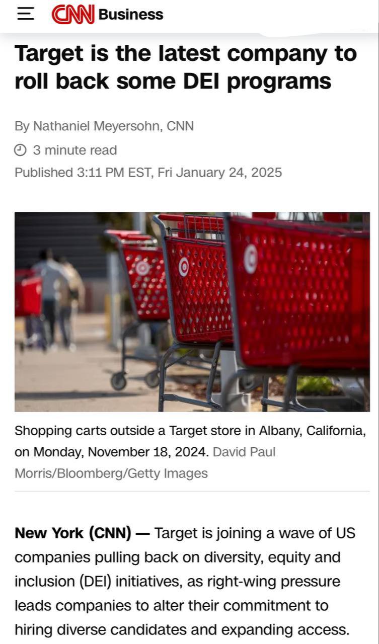 ΠΠΌΠ΅ΡΠΈΠΊΠ°Π½ΡΠΊΠΈΠΉ ΡΠΈΡΠ΅ΠΉΠ»Π΅Ρ Target — ΠΏΠΎΡΠ»Π΅Π΄Π½ΡΡ ΠΊΠΎΠΌΠΏΠ°Π½ΠΈΡ ΠΎΡΠΊΠ°Π·Π°Π²ΡΠ΅ΠΉΡΡ ΠΎΡ ΠΈΠ½ΠΈΡΠΈΠ°ΡΠΈΠ² ΠΏΠΎ ΠΌΠ½ΠΎΠ³ΠΎΠΎΠ±ΡΠ°Π·ΠΈΡ, ΡΠ°Π²Π½ΠΎΠΏΡΠ°Π²ΠΈΡ ΠΈ ΠΈΠ½ΠΊΠ»ΡΠ·ΠΈΠ²Π½ΠΎΡΡΠΈ (DEI), ΠΏΠΎΡΠΊΠΎΠ»ΡΠΊΡ Π΄Π°Π²Π»Π΅Π½ΠΈΠ΅ ΡΠΎ ΡΡΠΎΡΠΎΠ½Ρ ΠΏΡΠ°Π²ΡΡ Π·Π°ΡΡΠ°Π²Π»ΡΠ΅Ρ ΠΊΠΎΠΌΠΏΠ°Π½ΠΈΠΈ ΠΏΠ΅ΡΠ΅ΡΠΌΠ°ΡΡΠΈΠ²Π°ΡΡ ΡΠ²ΠΎΠΈ ΠΎΠ±ΡΠ·Π°ΡΠ΅Π»ΡΡΡΠ²Π° ΠΏΠΎ Π½Π°ΠΉΠΌΡ ΠΊΠ°Π½Π΄ΠΈΠ΄Π°ΡΠΎΠ², ΡΠΎΠΎΠ±ΡΠ°Π΅Ρ CNN.
