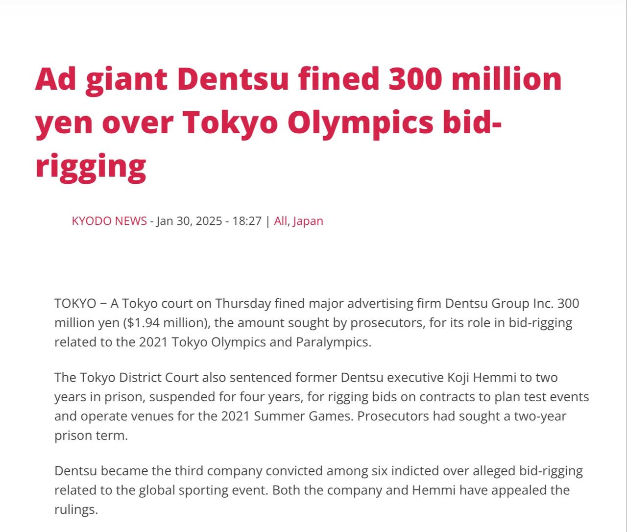 🤓 Dentsu продолжает платить за аферу на Олимпийских игр в Токио. Теперь ркламный гигант оштрафован на 300 млн иен (20 млн$) за сговор на олимпийских торгах.
