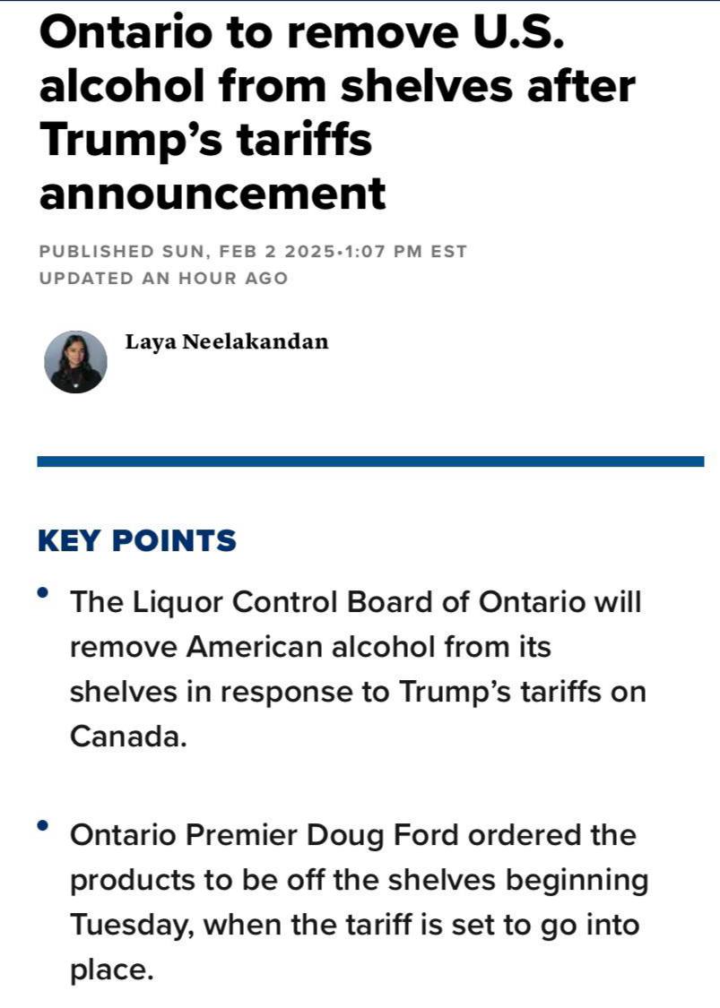 🤓Первые последствия новых тарифов США против Канады коснулись алкоголя.