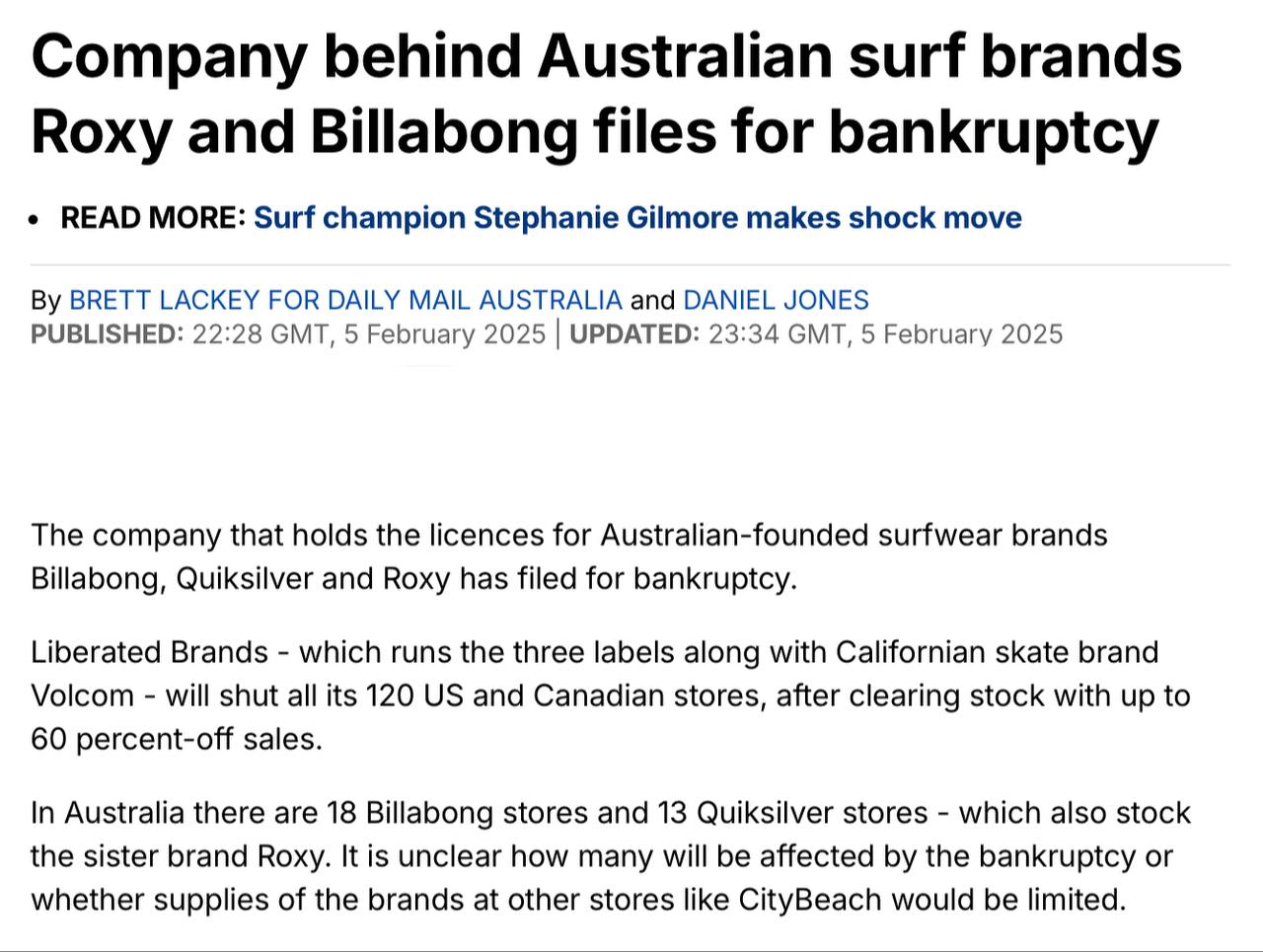 π€Π£Ρ ΠΎΠ΄ΠΈΡ ΡΠΏΠΎΡ Π°. ΠΠ»Π°Π΄Π΅Π»Π΅Ρ Π°Π²ΡΡΡΠ°Π»ΠΈΠΉΡΠΊΠΈΡ ΡΠ΅ΡΡ-Π±ΡΠ΅Π½Π΄ΠΎΠ² Roxy ΠΈ Billabong, ΠΏΠΎΠ΄Π°Π΅Ρ Π·Π°ΡΠ²Π»Π΅Π½ΠΈΠ΅ ΠΎ Π±Π°Π½ΠΊΡΠΎΡΡΡΠ²Π΅
