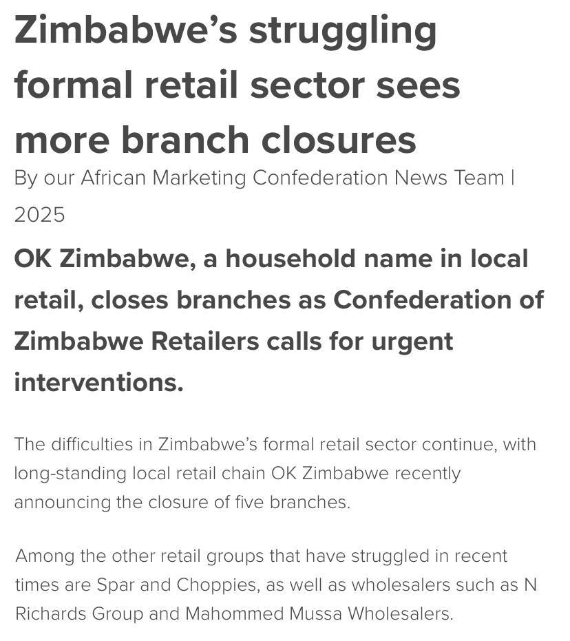 OK Zimbabwe недавно объявила о закрытии пяти филиалов, поскольку растет неформальная торговля, при которой продавцы предлагают товары по более низким ценам, потому что работают без строгого регулирования.