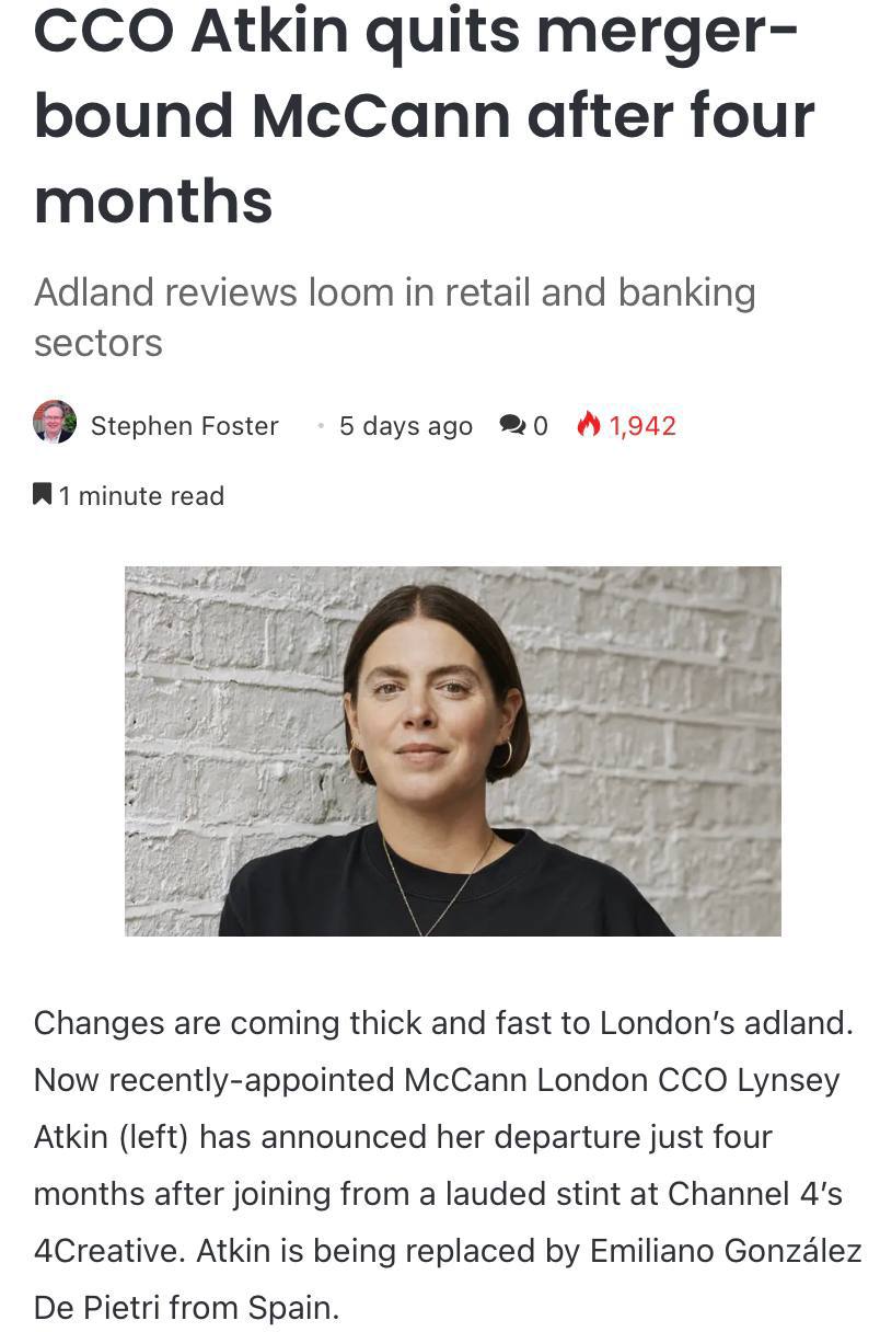 Креативный директор McCann London (Рекламное агентство) Линси Аткин покинула агентство после четырёх месяцев работы.