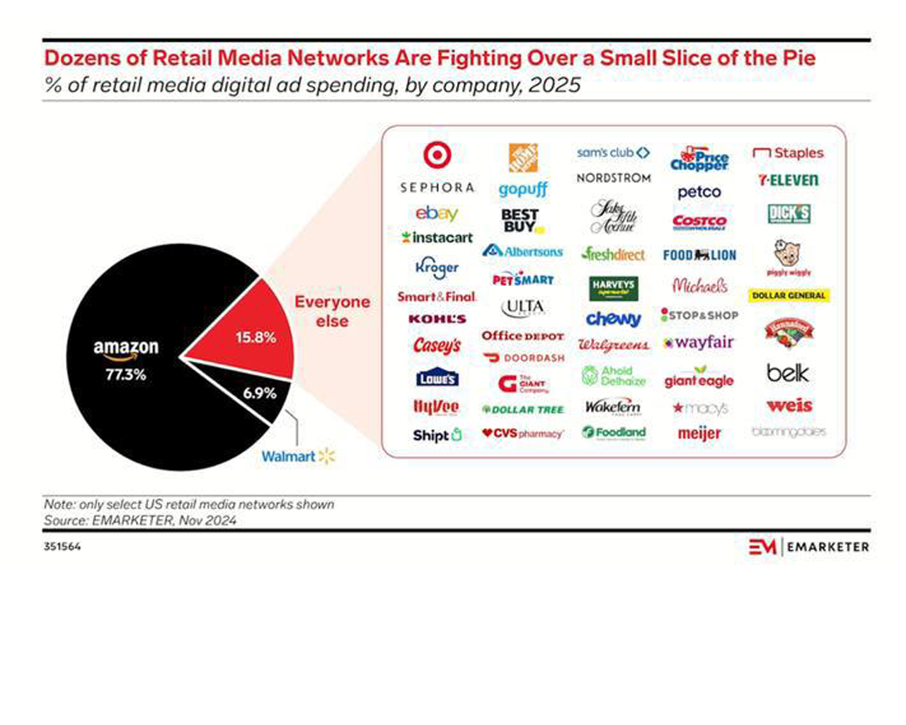 Там Amazon контролирует 77,3% всех расходов рекламодателей на ритейл-медиа, Walmart еще 7%, а сотни остальных игроков вместе борются за кусок пирога с долей примерно 16%.