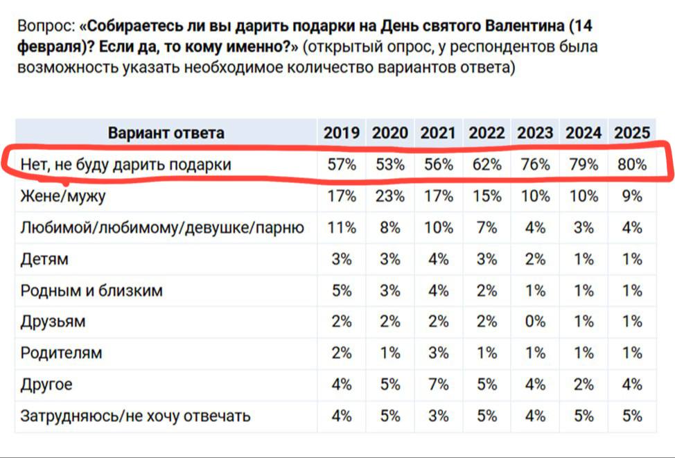 За 6 лет число не желающих дарить подарки в этот день увеличилось с 57 до 80%.