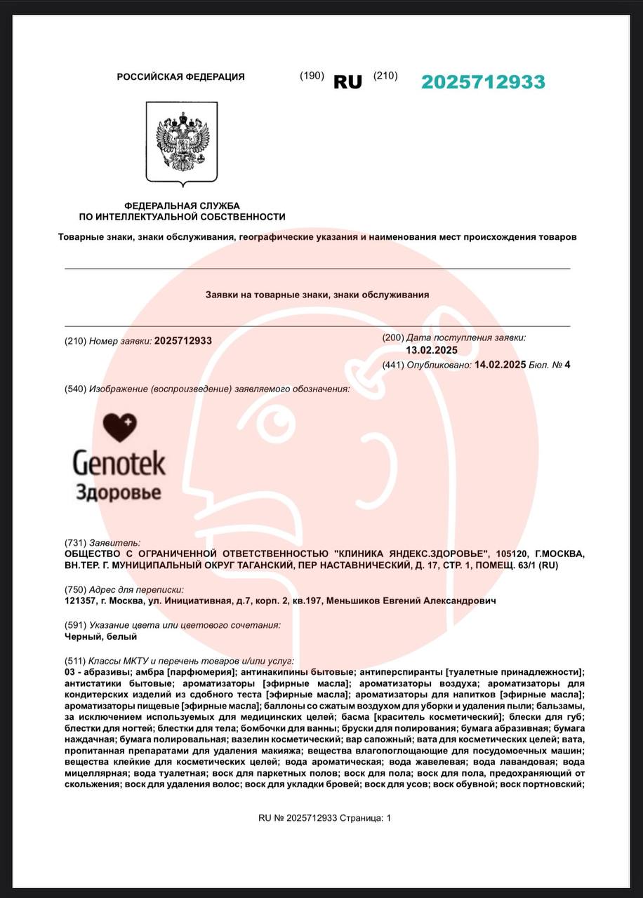 О чем это мы? Яндекс здоровье подал на регистрацию новые товарные знаки с Генотеком.