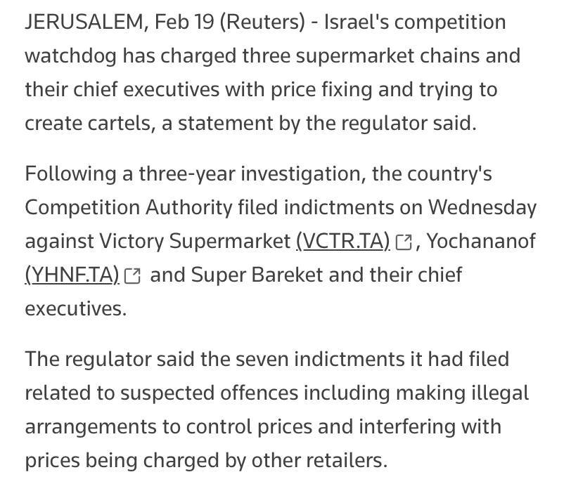 🤓Израильское антимонопольное ведомство по конкуренции предъявило обвинения трем крупным сетям супермаркетов — Victory, Yochananof и Super Bareket — и их генеральным директорам в ценовом сговоре и попытках создания картелей.