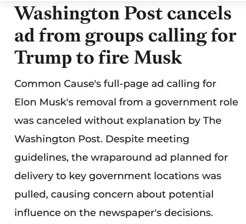 ΠΠ°ΠΏΡΠΈΠΌΠ΅Ρ. ΠΠ°Π·Π΅ΡΠ° The Washington Post Π±Π΅Π· ΠΎΠ±ΡΡΡΠ½Π΅Π½ΠΈΡ ΠΏΡΠΈΡΠΈΠ½ ΠΎΡΠΌΠ΅Π½ΠΈΠ»Π° ΠΏΠΎΠ»Π½ΠΎΡΡΡΠ°Π½ΠΈΡΠ½ΡΡ ΡΠ΅ΠΊΠ»Π°ΠΌΡ Common Cause (Π°ΠΌΠ΅ΡΠΈΠΊΠ°Π½ΡΠΊΠ°Ρ Π½Π΅ΠΊΠΎΠΌΠΌΠ΅ΡΡΠ΅ΡΠΊΠ°Ρ ΠΎΡΠ³Π°Π½ΠΈΠ·Π°ΡΠΈΡ, ΠΊΠΎΡΠΎΡΠ°Ρ, ΡΠΈΠΏΠ°, Π·Π°Π½ΠΈΠΌΠ°Π΅ΡΡΡ Π·Π°ΡΠΈΡΠΎΠΉ Π΄Π΅ΠΌΠΎΠΊΡΠ°ΡΠΈΠΈ), ΠΏΡΠΈΠ·ΡΠ²Π°ΡΡΡΡ ΠΎΡΡΡΡΠ°Π½ΠΈΡΡ ΠΠ»ΠΎΠ½Π° ΠΠ°ΡΠΊΠ° ΠΎΡ Π³ΠΎΡΡΠ΄Π°ΡΡΡΠ²Π΅Π½Π½ΠΎΠΉ Π΄ΠΎΠ»ΠΆΠ½ΠΎΡΡΠΈ. ΠΠ΅ΡΠΌΠΎΡΡΡ Π½Π° ΡΠΎΠ±Π»ΡΠ΄Π΅Π½ΠΈΠ΅ ΠΏΡΠ°Π²ΠΈΠ», ΡΠ΅ΠΊΠ»Π°ΠΌΠ° Π±ΡΠ»Π° ΡΠ½ΡΡΠ°.
