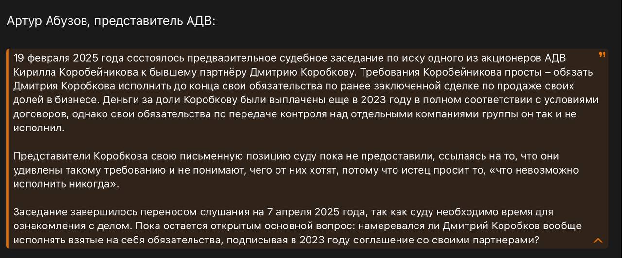 🤓Позиция юриста представляющего интересы АДВ по вчерашнему слушанию встречного иска АДВ/Коробков, которую публикуют в некоторых СМИ сегодня.