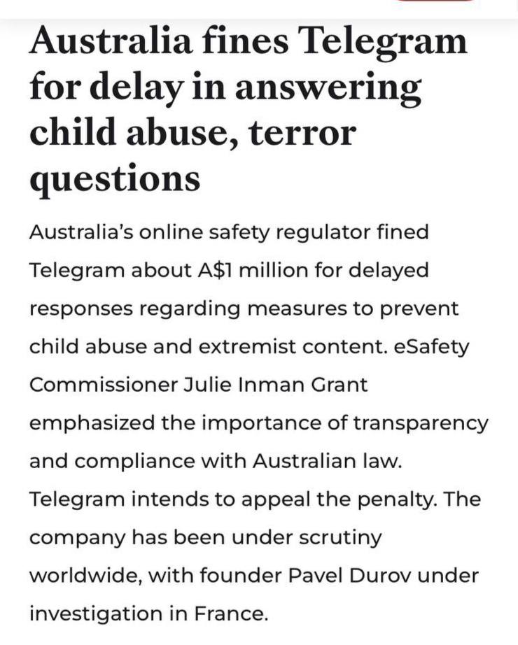 Австралийский комиссар по электронной безопасности наложил на Telegram штраф в размере почти 1 миллиона долларов за 160-дневную задержку в предоставлении информации о мерах по борьбе с материалами, связанными с детской эксплуатацией и терроризмом на платформе.