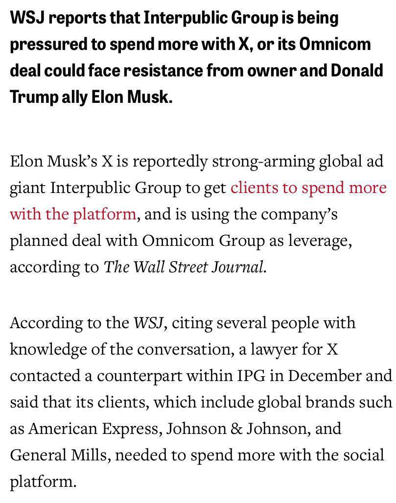 По сообщению WSJ со ссылкой на нескольких человек, знакомых с ходом разговора, адвокат X связался с представителями IPG в декабре и сказал, что клиентам, в число которых входят такие мировые бренды, как American Express, Johnson & Johnson и General Mills, необходимо тратить больше средств на социальную платформу.