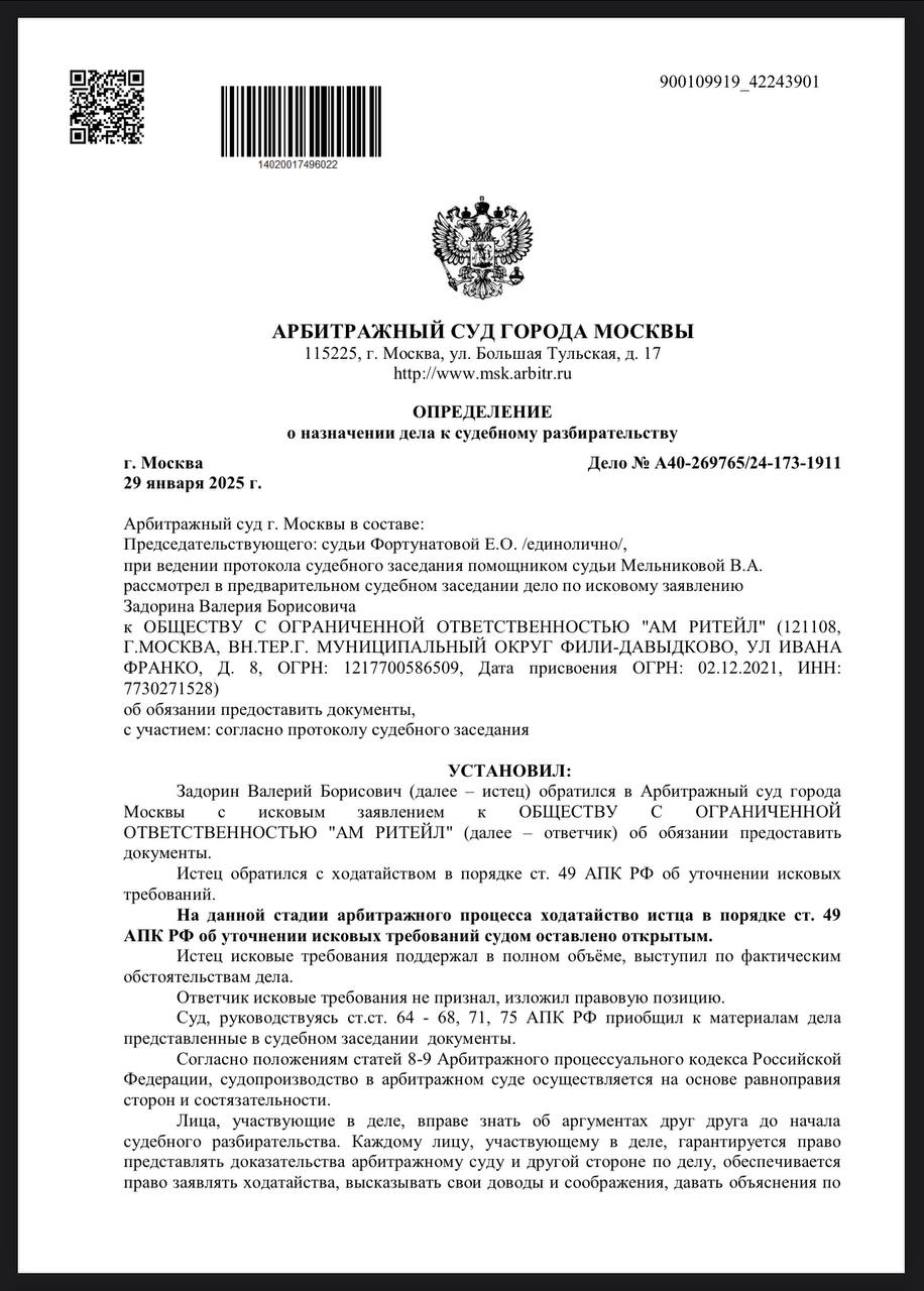 Иск подан еще в ноябре 2024 г. 18 февраля 2025 г. суд принял еще один иск Валерия Задорина — к основному владельцу (57,5%) сети Павлу Задорину о признании сделки недействительной. О какой сделке и каких документах идет речь, в определениях суда не уточняется.