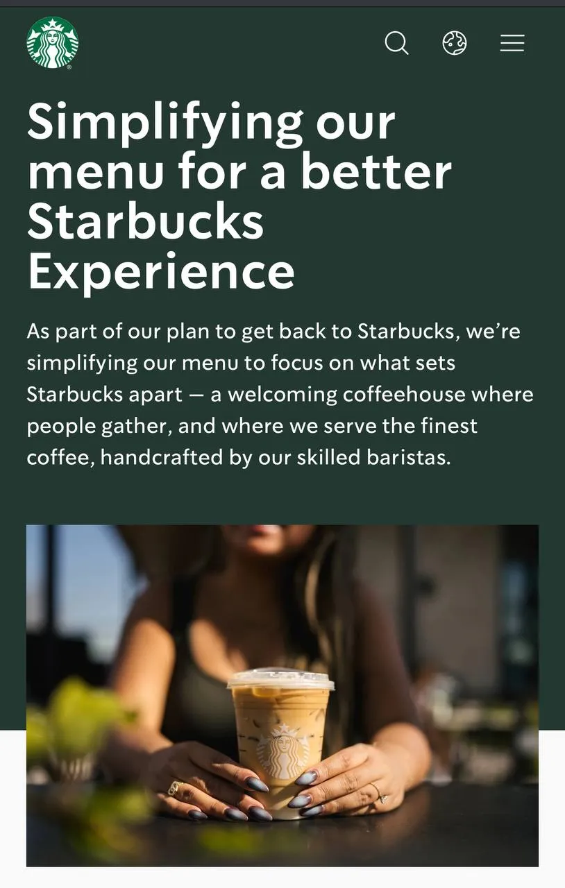 «ΠΡΠΈ ΠΏΠΎΠ·ΠΈΡΠΈΠΈ Π½Π΅ΡΠ°ΡΡΠΎ ΠΏΠΎΠΊΡΠΏΠ°ΡΡΡΡ, ΠΈΡ ΡΠ»ΠΎΠΆΠ½ΠΎ ΠΏΡΠΈΠ³ΠΎΡΠΎΠ²ΠΈΡΡ, ΠΈΠ»ΠΈ ΠΎΠ½ΠΈ ΠΏΠΎΡ ΠΎΠΆΠΈ Π½Π° Π΄ΡΡΠ³ΠΈΠ΅ Π½Π°ΠΏΠΈΡΠΊΠΈ Π² Π½Π°ΡΠ΅ΠΌ ΠΌΠ΅Π½Ρ», — Π½Π°ΠΏΠΈΡΠ°Π»Π° Starbucks. ΠΠΎΠΌΠΏΠ°Π½ΠΈΡ ΠΈΠ· Π‘ΠΈΡΡΠ»Π° Π΄ΠΎΠ±Π°Π²ΠΈΠ»Π°, ΡΡΠΎ ΡΠΏΡΠΎΡΠ΅Π½ΠΈΠ΅ ΠΌΠ΅Π½Ρ ΠΏΠΎΠ·Π²ΠΎΠ»ΠΈΡ Π΅ΠΉ «ΡΠΎΡΡΠ΅Π΄ΠΎΡΠΎΡΠΈΡΡΡΡ Π½Π° ΠΌΠ΅Π½ΡΡΠ΅ΠΌ ΠΊΠΎΠ»ΠΈΡΠ΅ΡΡΠ²Π΅ Π±ΠΎΠ»Π΅Π΅ ΠΏΠΎΠΏΡΠ»ΡΡΠ½ΡΡ ΠΏΠΎΠ·ΠΈΡΠΈΠΉ, Π²ΡΠΏΠΎΠ»Π½Π΅Π½Π½ΡΡ Ρ ΠΏΡΠ΅Π²ΠΎΡΡ ΠΎΠ΄Π½ΡΠΌ ΠΊΠ°ΡΠ΅ΡΡΠ²ΠΎΠΌ».