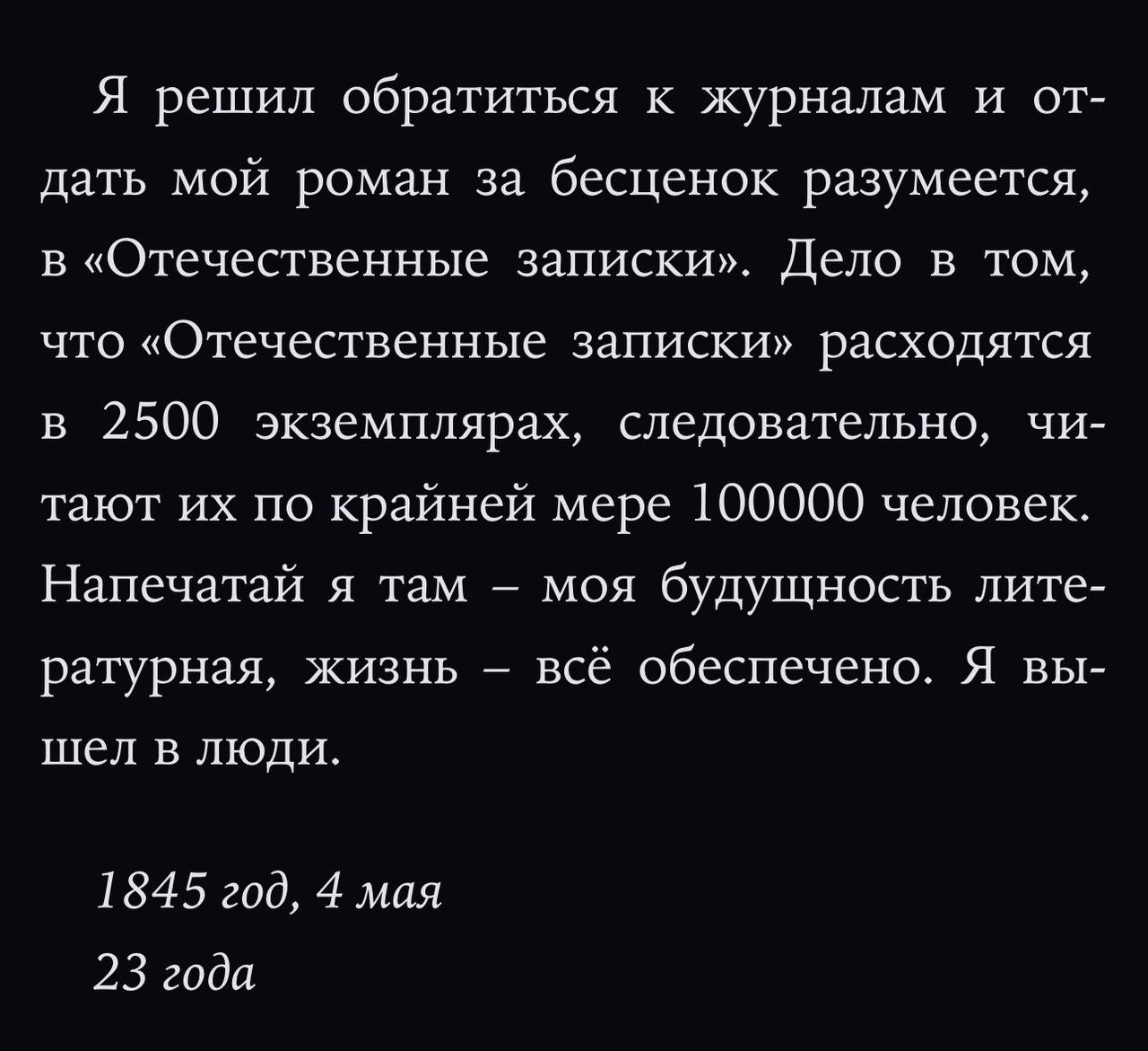 🤓И о тиражах печатной прессы… При Достоевском один печатный экземпляр журнала читало «по крайней мере» 40 человек. Во всяком случае, так полагал сам Федор Михайлович.