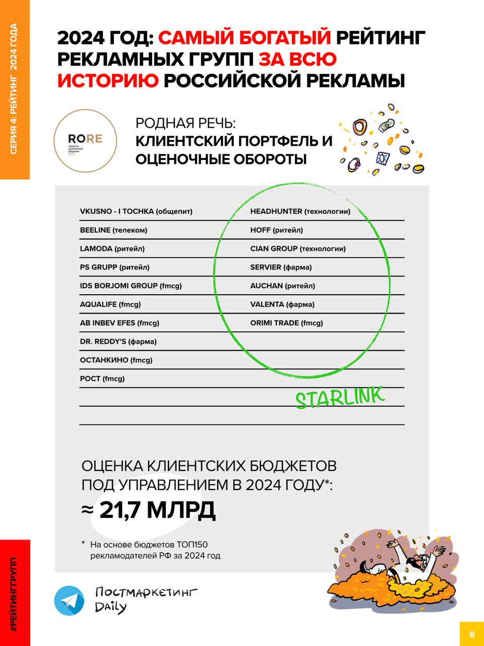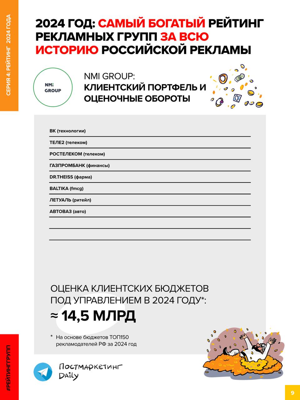 🤓Новая серия Полного Рейтинга рекламных групп и агентств за 2024 год от Постмаркетинг Daily. Не забываем, что это — Самый богатый Рейтинг за всю историю российской рекламы.