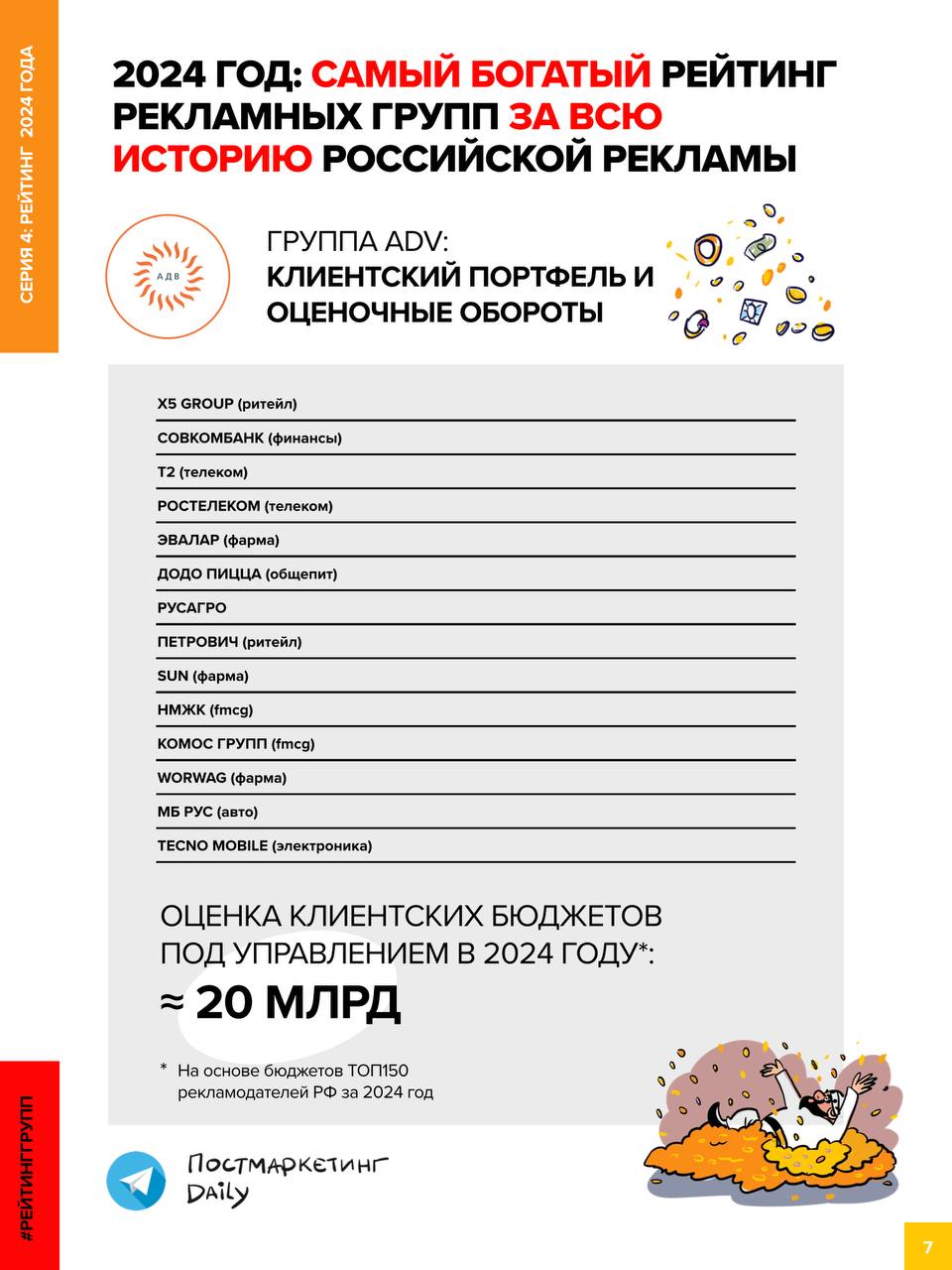 🤓Продолжаем публикацию Полного Рейтинга рекламных групп и агентств за 2024 год от Постмаркетинг Daily. Как вы помните это — Самый богатый Рейтинг за всю историю российской рекламы.