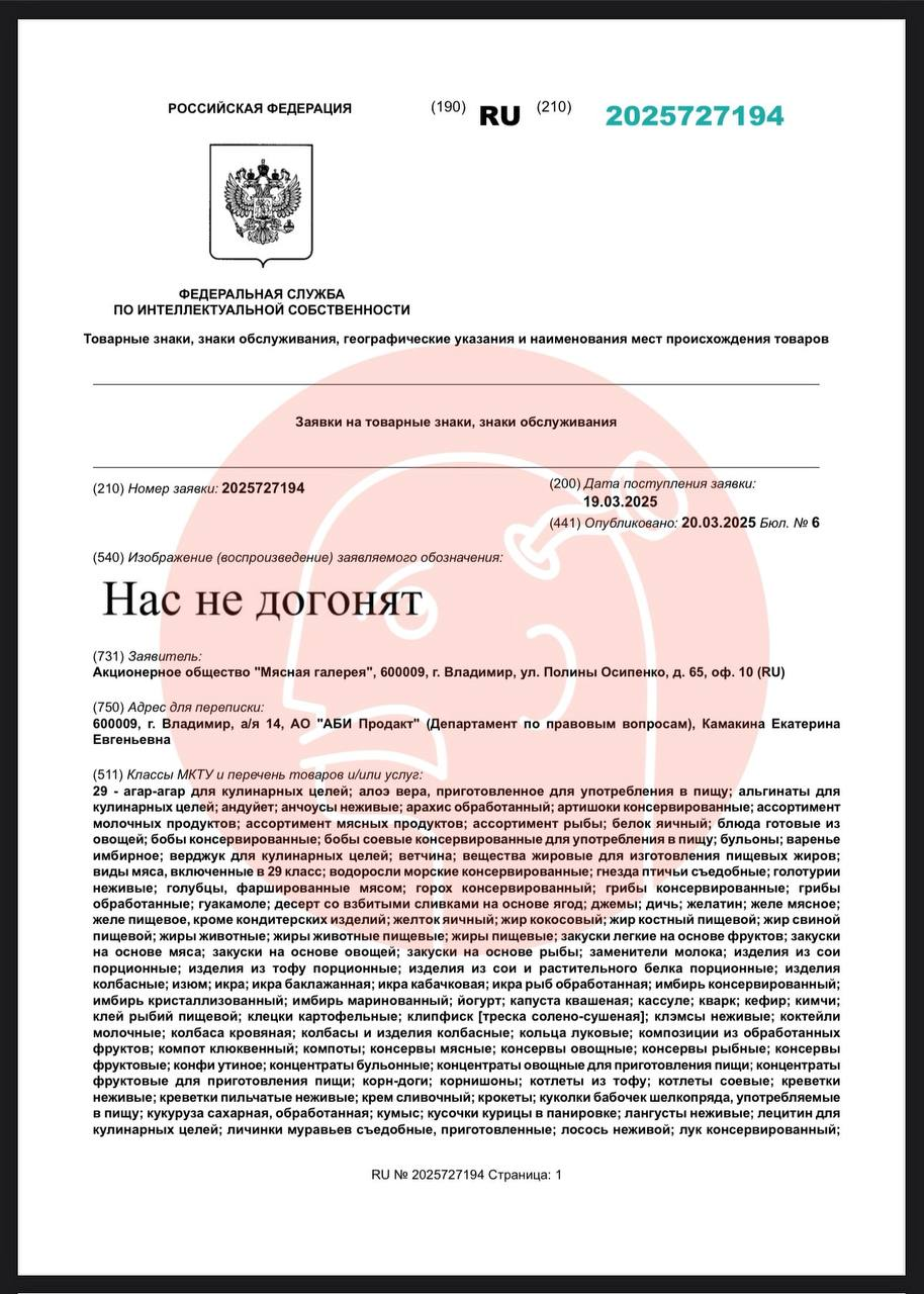 🤓Крупный производитель колбасы и сосисек Аби из Владимира регистрирует товарный знак «Нас не догонят».