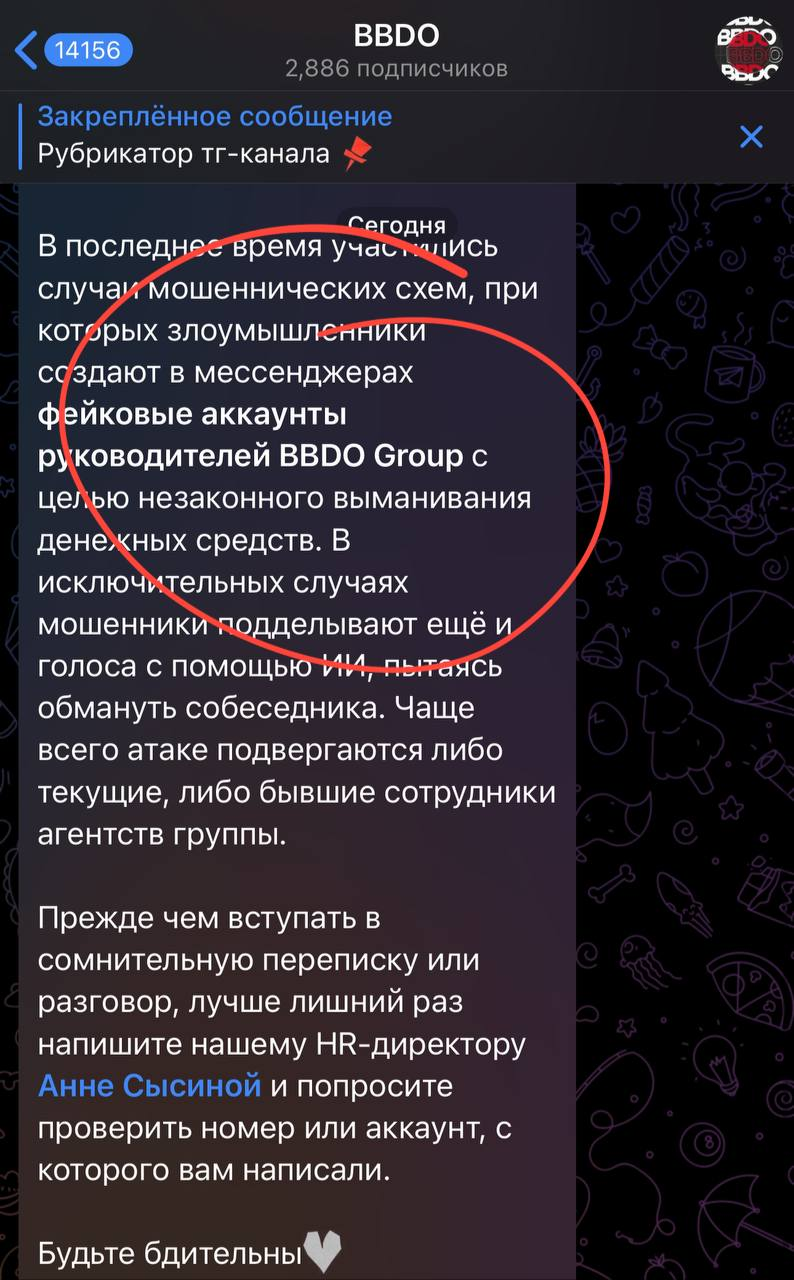 ⚡️В последнее время участились случаи мошеннических схем, при которых злоумышленники создают в мессенджерах фейковые аккаунты руководителей BBDO Group с целью незаконного выманивания денежных средств. Чаще всего атаке подвергаются либо текущие, либо бывшие сотрудники агентств группы...