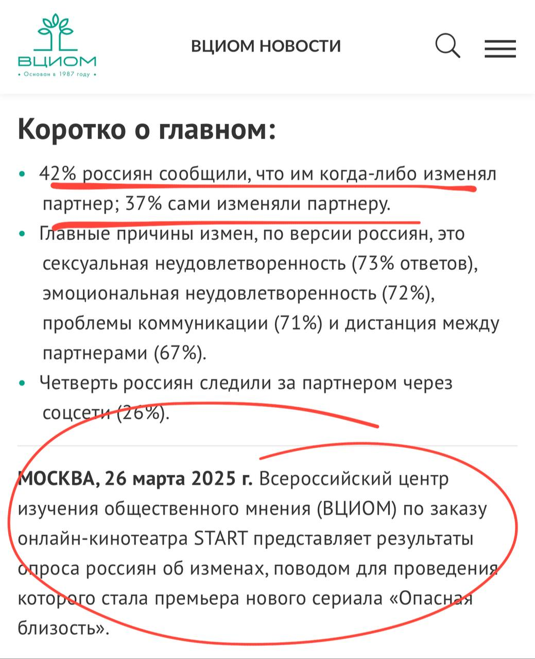 🤔Очень странный способ промо сериалов выбрал кинотеатр Старт. Они заказали ВЦИОМу исследование темы измен в современном обществе.