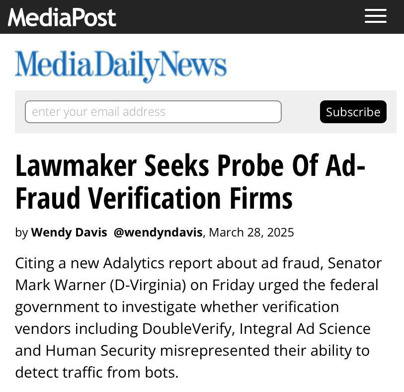 «Исследования показывают, что некоторые компании, занимающиеся проверкой рекламы, делают явно ложные и вводящие в заблуждение заявления о том, что они позволяют избегать ботов и гарантировать, что платный рекламный контент будет показан людям», — говорится в письме Уорнера председателю Федеральной торговой комиссии Эндрю Фергюсону.