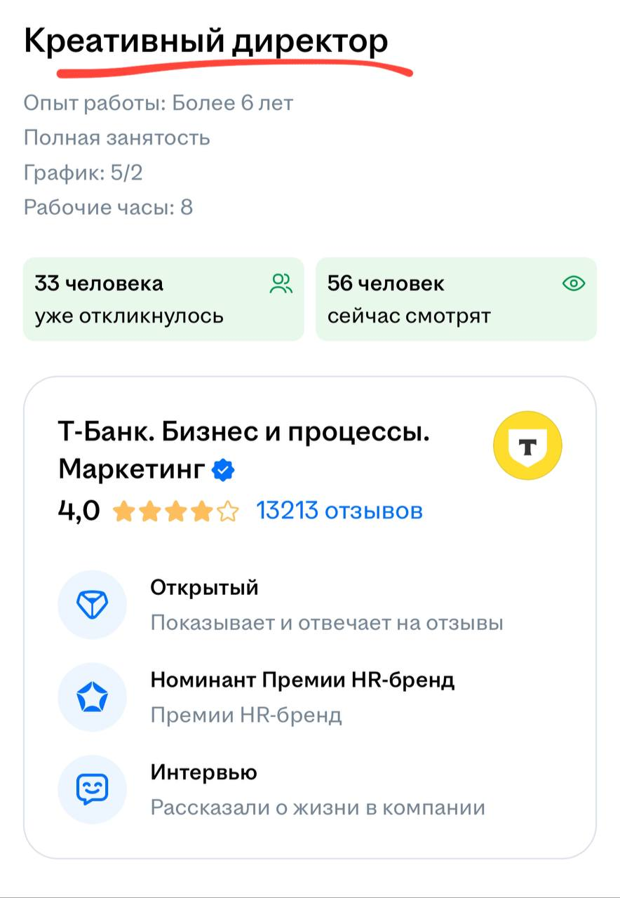 Как в плохом анекдоте. Т-банк ищет целого «Креативного директора», но требует чтобы он сам делал ресайзы банеров.